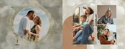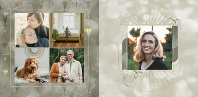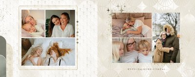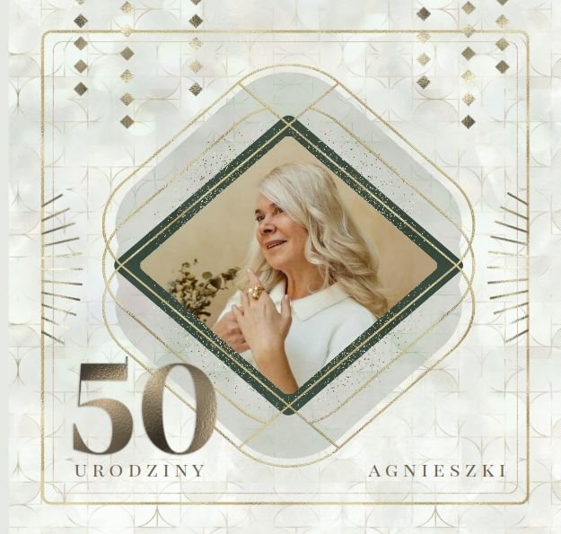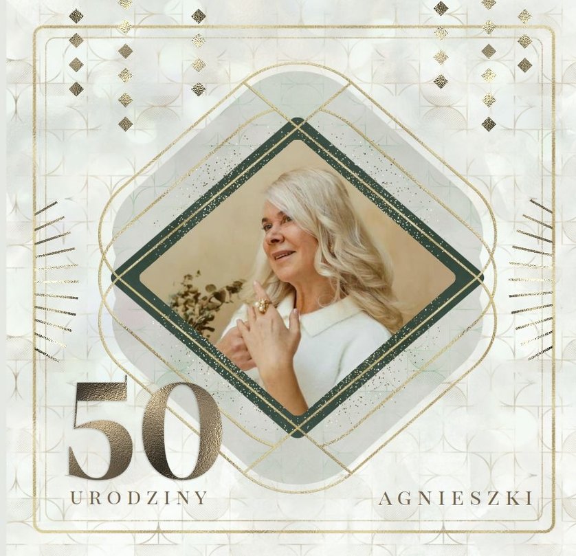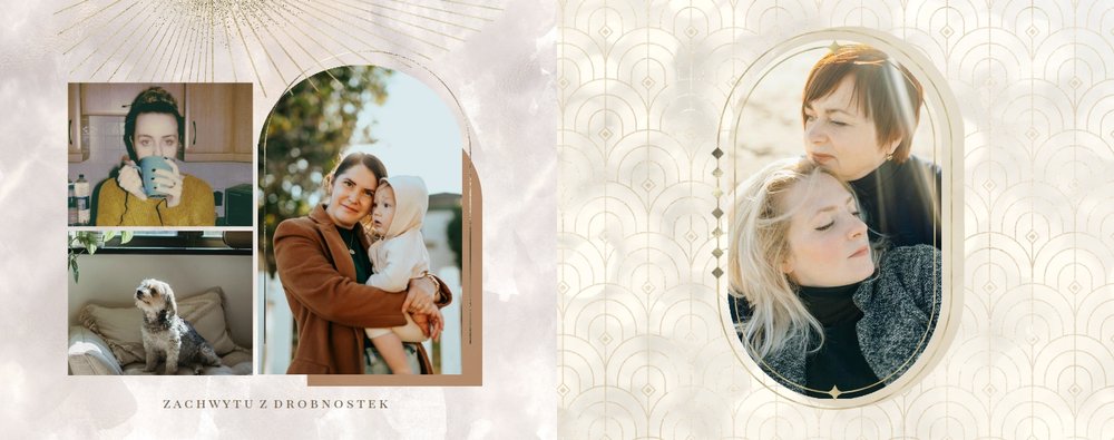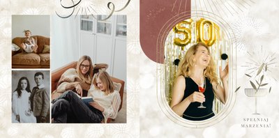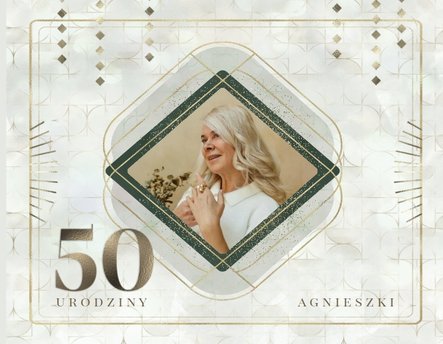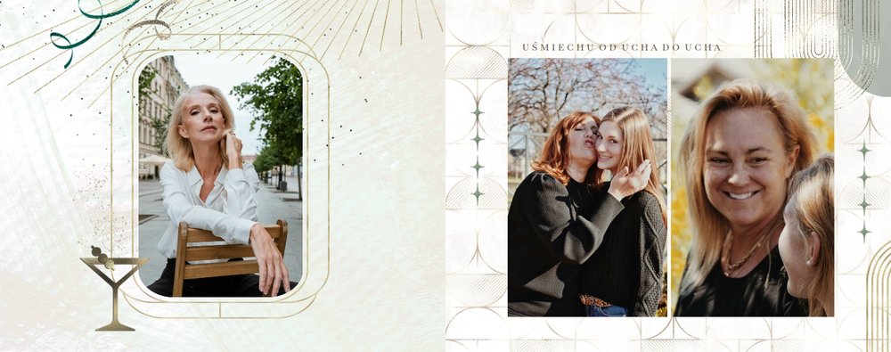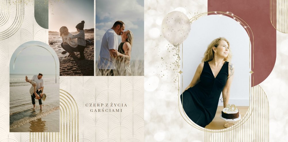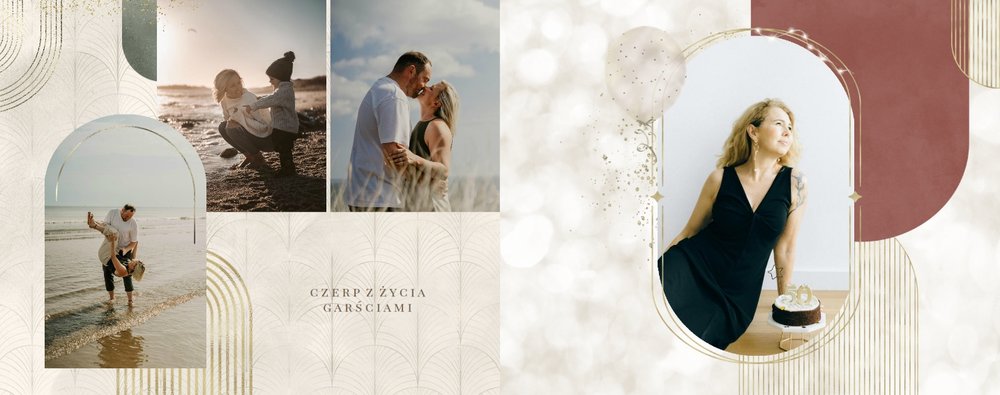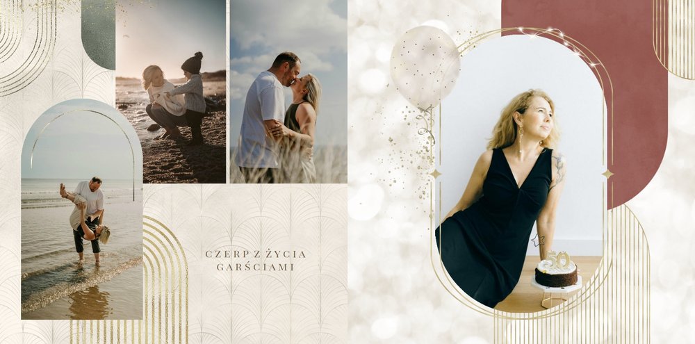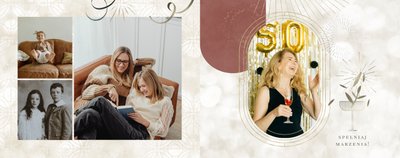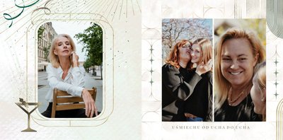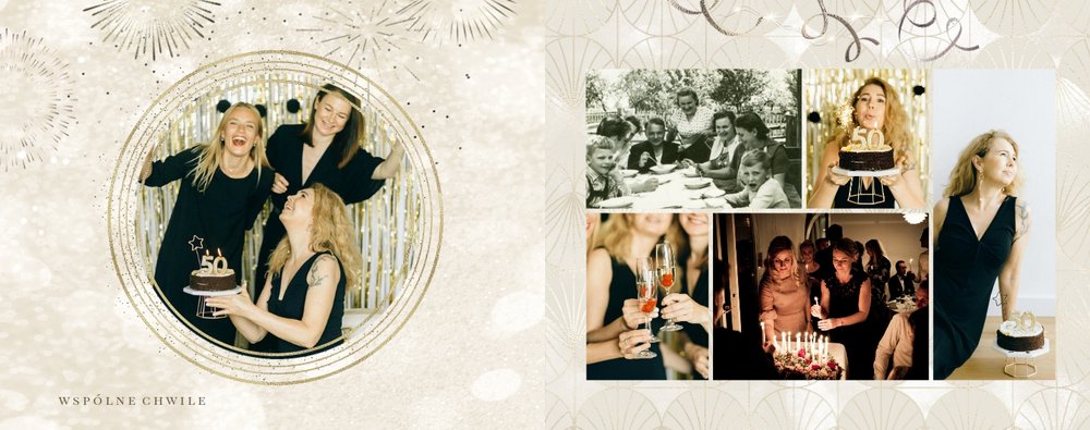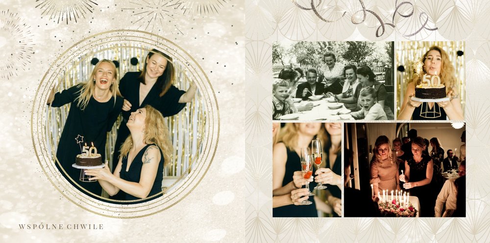 Delikatniejsza, kobieca wersja szablonu "50 urodziny mężczyzny", również nawiązująca swoim stylem do stylu artdeco, jednak tym razem wpisująca się idealnie w kobiece gusta. Obłe kształty (takie jak stylowe łuczki czy koła) oraz jasne, stonowane kolory dodają całości elegancji, podkreślając przy tym każde zdjęcie solenizantki. Metaliczne elementy nawiązują do celebracji i podkreślają urodzinowy charakter fotoksiążki. Układy komórek zdjęciowych świetnie skomponują się z zarówno skanowanymi zdjęciami sprzed lat, jak i nowoczesnymi zdjęciami zrobionymi smartfonem.