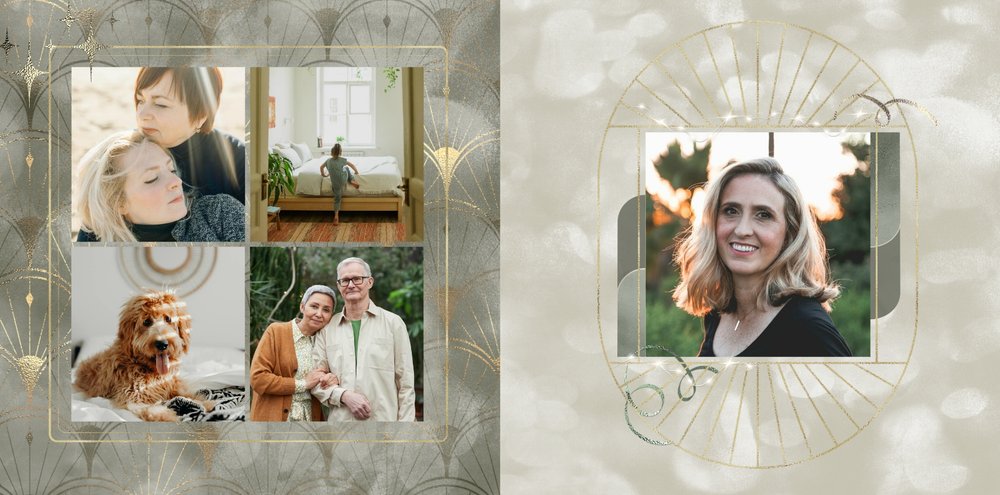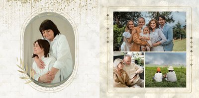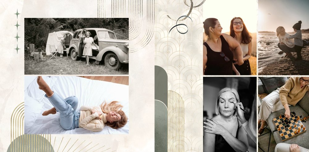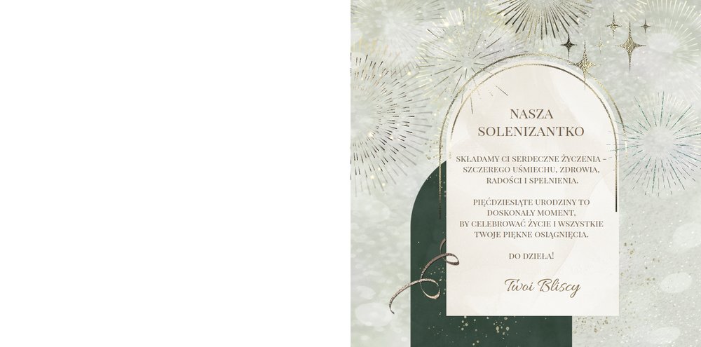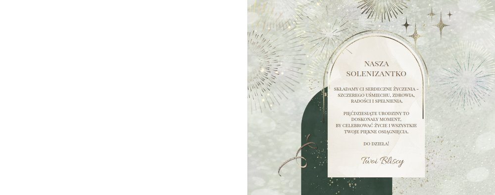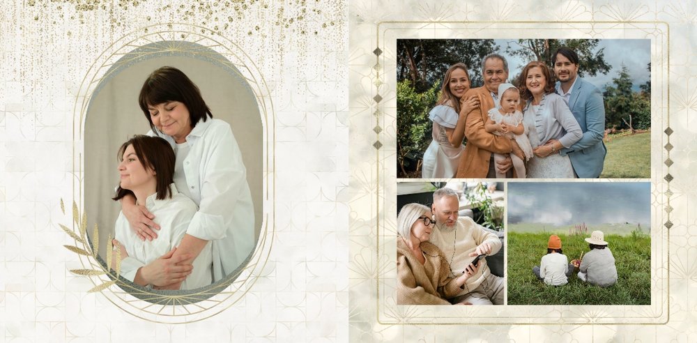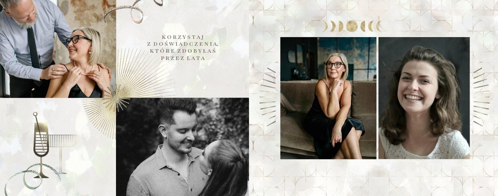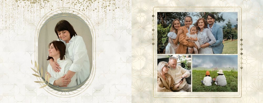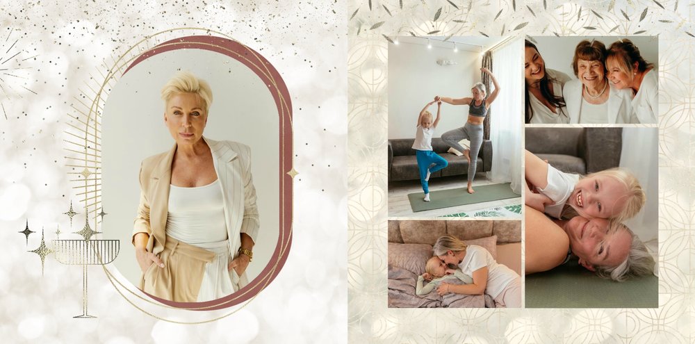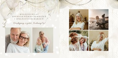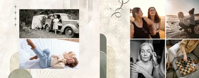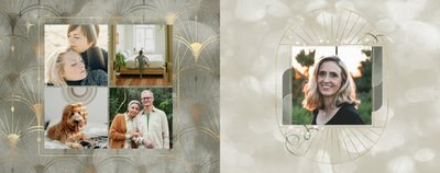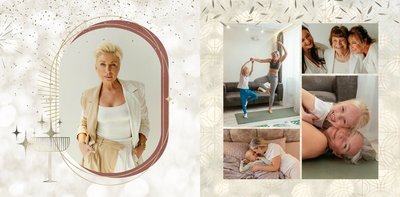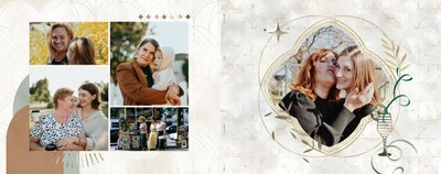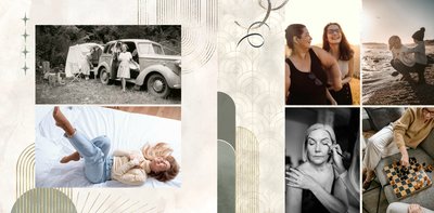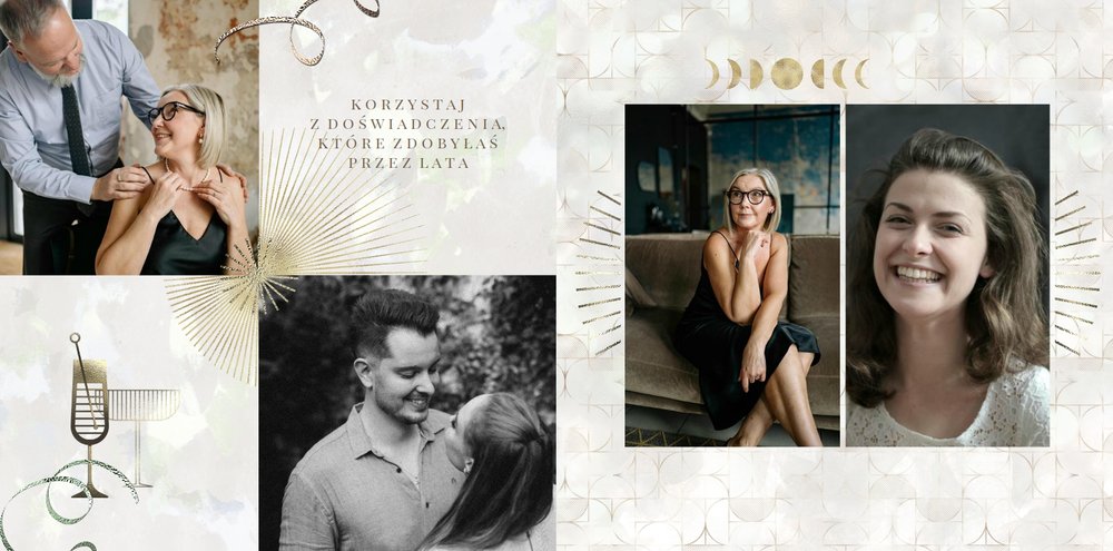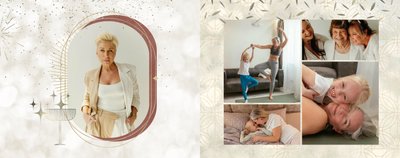 Delikatniejsza, kobieca wersja szablonu "50 urodziny mężczyzny", również nawiązująca swoim stylem do stylu artdeco, jednak tym razem wpisująca się idealnie w kobiece gusta. Obłe kształty (takie jak stylowe łuczki czy koła) oraz jasne, stonowane kolory dodają całości elegancji, podkreślając przy tym każde zdjęcie solenizantki. Metaliczne elementy nawiązują do celebracji i podkreślają urodzinowy charakter fotoksiążki. Układy komórek zdjęciowych świetnie skomponują się z zarówno skanowanymi zdjęciami sprzed lat, jak i nowoczesnymi zdjęciami zrobionymi smartfonem.