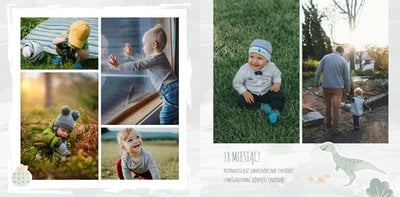 Spraw swojemu dziecku niezapomnianą pamiątkę z jego najpiękniejszych lat. Szablon fotoksiążki "Album na zdjęcia - dinozaury" został stworzony z myślą dla wszystkich małych wielbicieli dinozaurów. Kolorowe tła - głównie w odcieniach zieleni i błękitu - podkreślą każde zdjęcie Twojego dziecka, a dinusiowe ilustracje dodadzą uroku i zachęcą do częstego wracania do wspomnień. Z tak przygotowaną fotoksiążką zachowasz najcenniejsze wspomnienia swojego dziecka na lata.