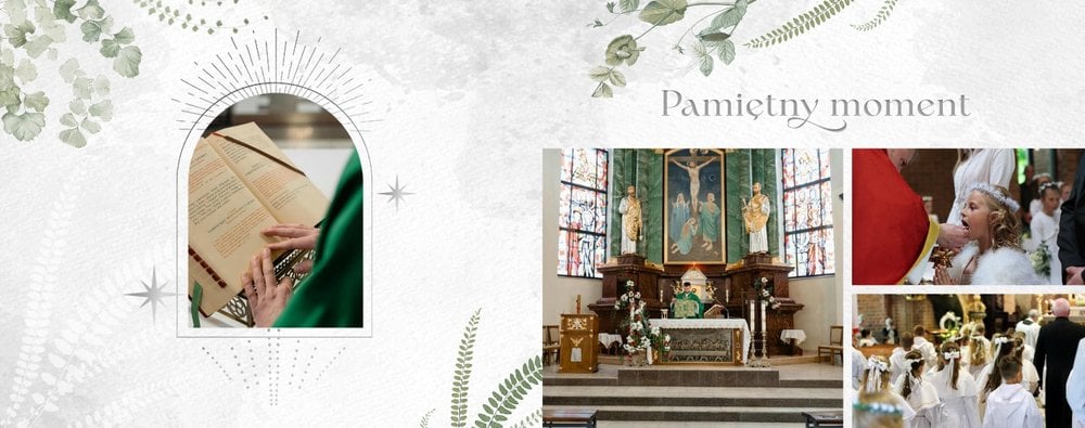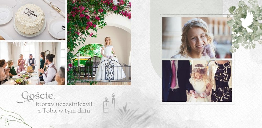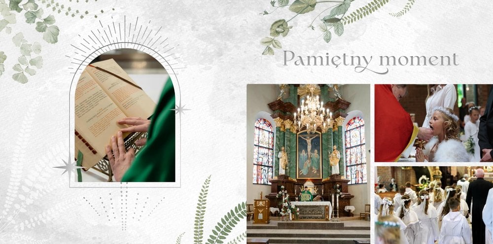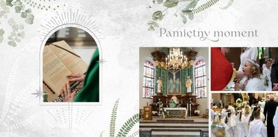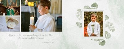 Każda strona została starannie zaprojektowana, by jak najlepiej oddać wzniosłą atmosferę sakramentu. Botaniczne wzory stanowią ozdobę zdjęć i podkreślają charakter ceremonii. Całość zachowana jest w odcieniach zieleni i srebra. Uniwersalny design sprawia, że fotoksiążka będzie świetnym upamiętnieniem zarówno sakramentu chłopca, jak i dziewczynki. Projekt został uzupełniony o sentencje z Pisma Świętego oraz cytaty i fragmenty Psalmów. Gotowe ułożenie elementów oraz układy komórek zdjęciowych zapewniają intuicyjne projektowanie. Możesz skorzystać ze spontanicznych zdjęć zrobionych telefonem, jak i tych profesjonalnych od fotografa.