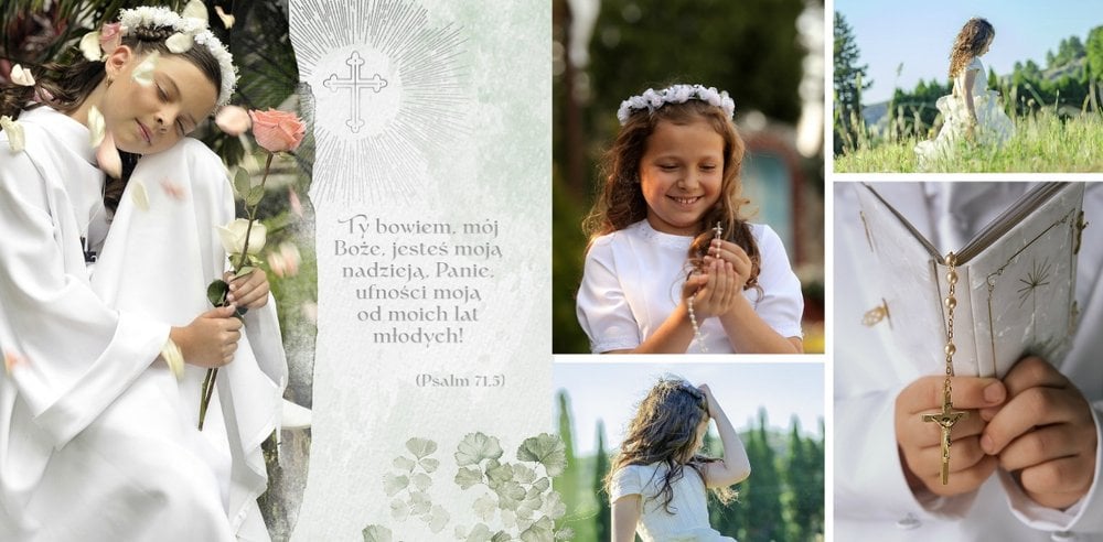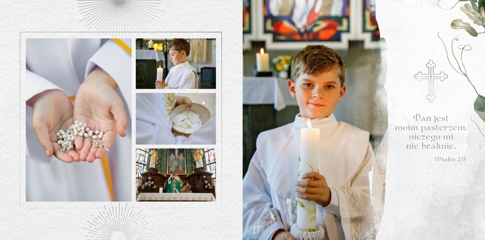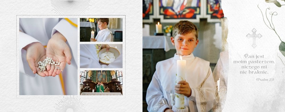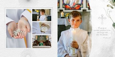 Pierwsza Komunia Święta to jeden z najważniejszych sakramentów dziecka. Stwórz uroczystą pamiątkę ze zdjęciami, korzystając z szablonu fotoksiążki "Album z Pierwszej Komunii Świętej" i zachowaj ważne wspomnienia dla siebie i bliskich.
