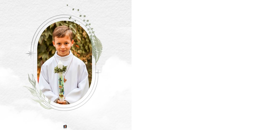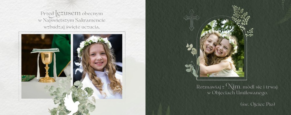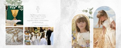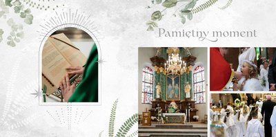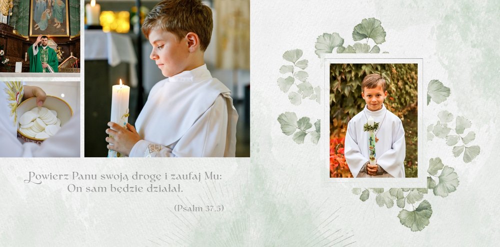 Każda strona została starannie zaprojektowana, by jak najlepiej oddać wzniosłą atmosferę sakramentu. Botaniczne wzory stanowią ozdobę zdjęć i podkreślają charakter ceremonii. Całość zachowana jest w odcieniach zieleni i srebra. Uniwersalny design sprawia, że fotoksiążka będzie świetnym upamiętnieniem zarówno sakramentu chłopca, jak i dziewczynki. Projekt został uzupełniony o sentencje z Pisma Świętego oraz cytaty i fragmenty Psalmów. Gotowe ułożenie elementów oraz układy komórek zdjęciowych zapewniają intuicyjne projektowanie. Możesz skorzystać ze spontanicznych zdjęć zrobionych telefonem, jak i tych profesjonalnych od fotografa.