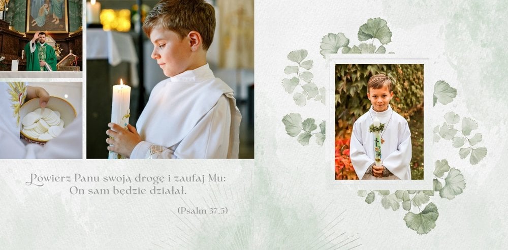 Każda strona została starannie zaprojektowana, by jak najlepiej oddać wzniosłą atmosferę sakramentu. Botaniczne wzory stanowią ozdobę zdjęć i podkreślają charakter ceremonii. Całość zachowana jest w odcieniach zieleni i srebra. Uniwersalny design sprawia, że fotoksiążka będzie świetnym upamiętnieniem zarówno sakramentu chłopca, jak i dziewczynki. Projekt został uzupełniony o sentencje z Pisma Świętego oraz cytaty i fragmenty Psalmów. Gotowe ułożenie elementów oraz układy komórek zdjęciowych zapewniają intuicyjne projektowanie. Możesz skorzystać ze spontanicznych zdjęć zrobionych telefonem, jak i tych profesjonalnych od fotografa.