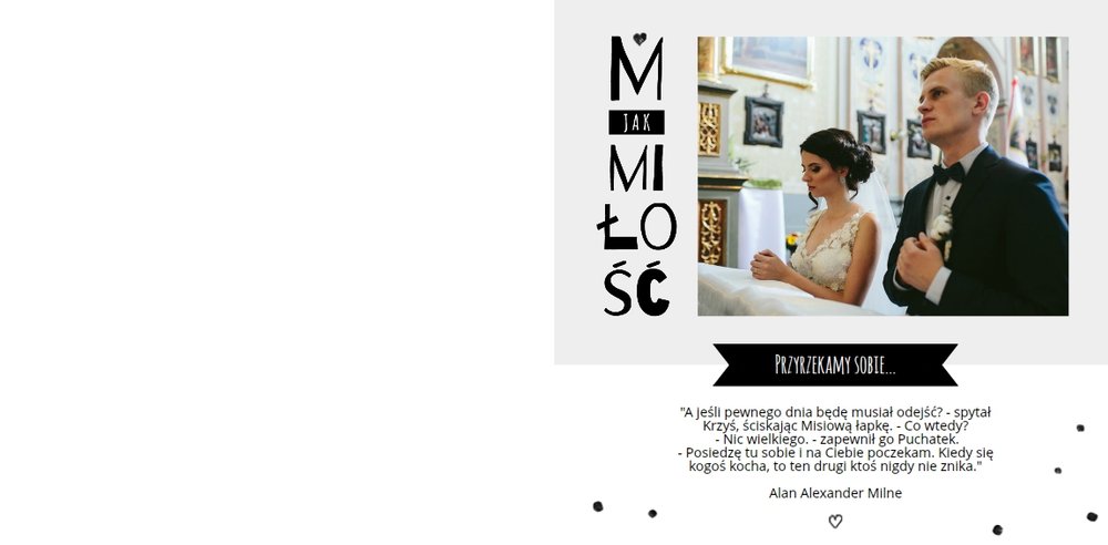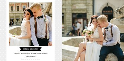 Szablon Bardzo Bardzo Kocham Cię świetnie sprawdzi się przy projektowaniu fotoksiążki z wesela lub ze ślubnej sesji zdjęciowej. Dzięki niemu wydrukujesz najpiękniejsze chwile w wyjątkowej formie. Kolorystyka w różnych odcieniach szarości, czarne napisy i minimalistyczna grafika sprawiają, że książka wygląda bardzo oryginalnie. Szablon Bardzo Bardzo Kocham Cię tworzy serię razem z szablonem Bardzo Bardzo Dziękujemy - podziękowaniami dla rodziców Młodej Pary.