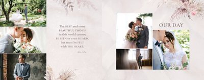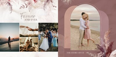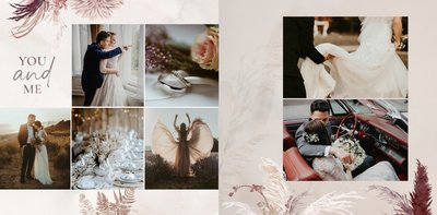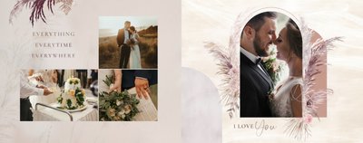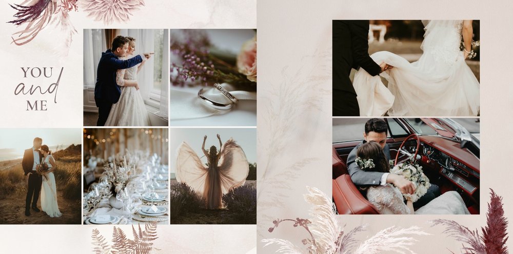 Twoje ślubne fotografie przy akompaniamencie lekkiego wzornictwa w stylu boho utworzą wspaniałe kompozycje na stronach fotoksiążki. Szablon "Boho Wedding" to idealne miejsce dla tych niepowtarzalnych wspomnień, które doświadcza się tylko raz w życiu.