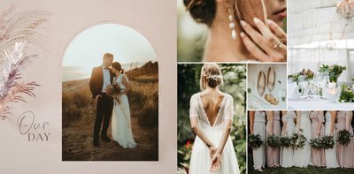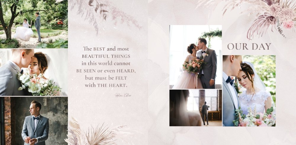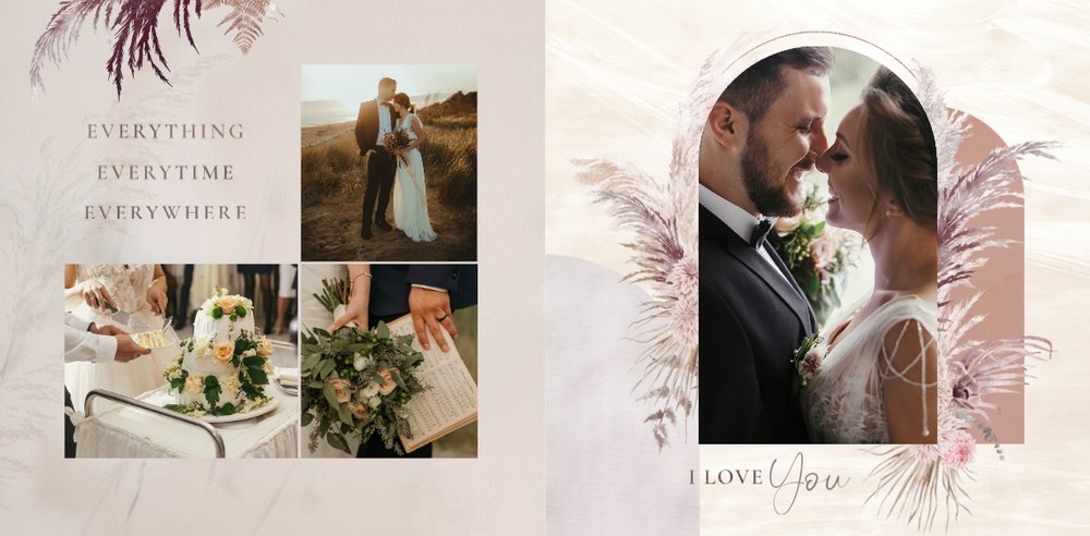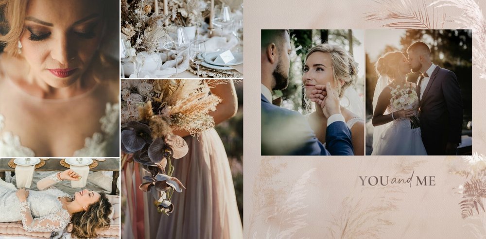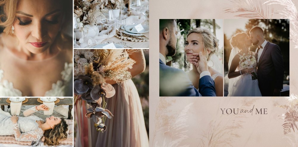 Kolorystyka skupia się wokół beżu, pastelowego różu i lekkiego burgundu - tworząc tym samym stonowany, aczkolwiek nietypowy design. Strony przyozdobione zostały w elementy bliskie naturze, takie jak trawy pampasowe, palmy czy liście strelicji. Wąskie złote łuki subtelnie podkreślają elegancję i wzniosłość uwidocznioną na zdjęciach. Całość dopełniają zapiski sentencji i krótkich romantycznych wyrażeń.