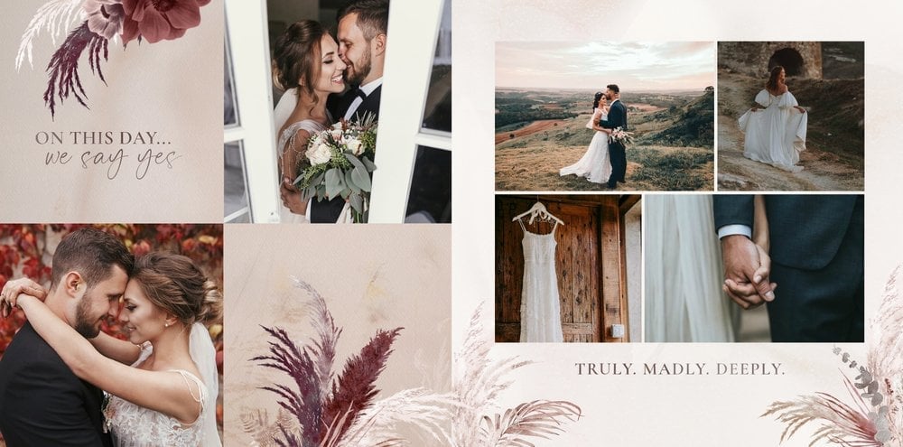 Kolorystyka skupia się wokół beżu, pastelowego różu i lekkiego burgundu - tworząc tym samym stonowany, aczkolwiek nietypowy design. Strony przyozdobione zostały w elementy bliskie naturze, takie jak trawy pampasowe, palmy czy liście strelicji. Wąskie złote łuki subtelnie podkreślają elegancję i wzniosłość uwidocznioną na zdjęciach. Całość dopełniają zapiski sentencji i krótkich romantycznych wyrażeń.