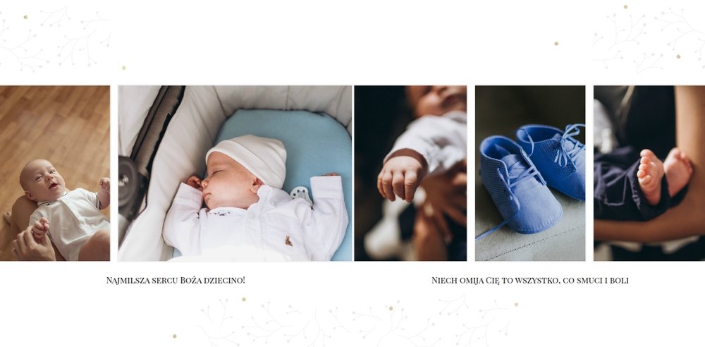 Szablon “Chrzciny” to uniwersalna propozycja albumu na chrzest dla chłopca i dla dziewczynki. Oprawa graficzna składa się z subtelnych zdobień, co podkreśla charakter pamiątki i współgra ze zdjęciami malucha. Dopełnienie stanowi biało-złota kolorystyka albumu - chrzest jednoznacznie się z nią kojarzy.