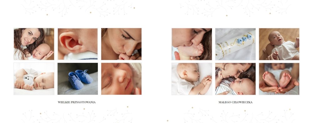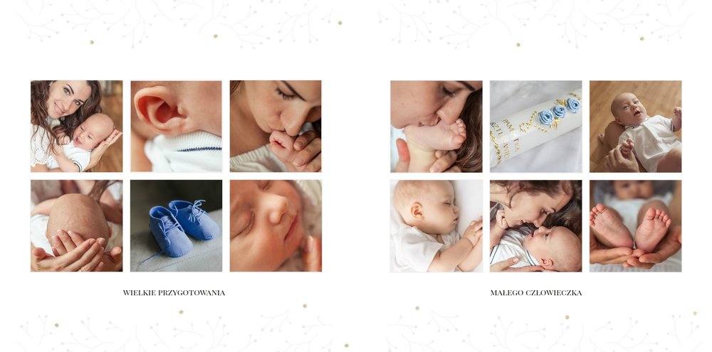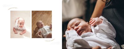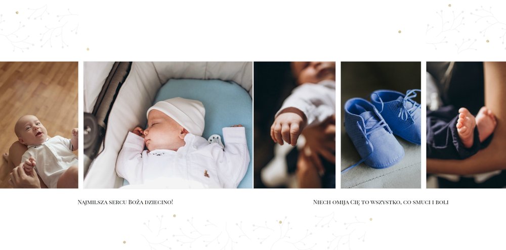 Szablon “Chrzciny” to uniwersalna propozycja albumu na chrzest dla chłopca i dla dziewczynki. Oprawa graficzna składa się z subtelnych zdobień, co podkreśla charakter pamiątki i współgra ze zdjęciami malucha. Dopełnienie stanowi biało-złota kolorystyka albumu - chrzest jednoznacznie się z nią kojarzy.