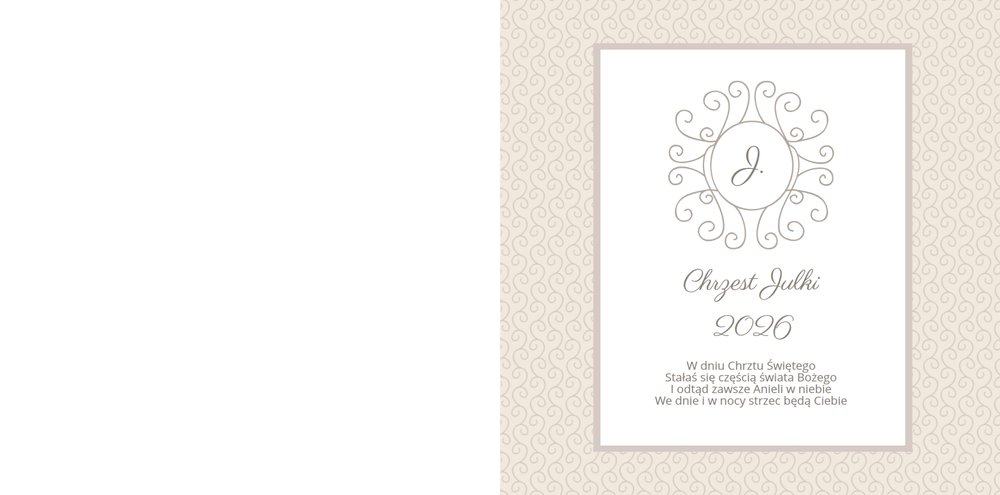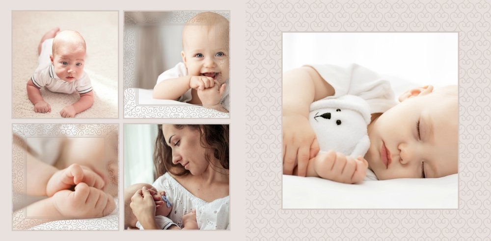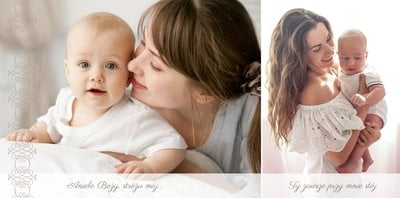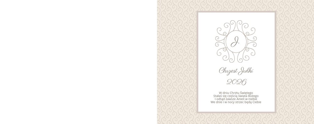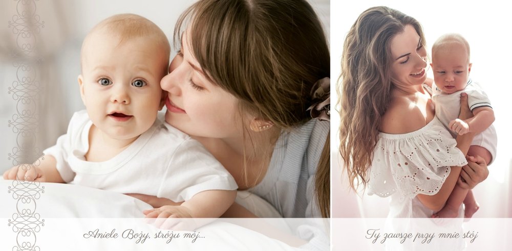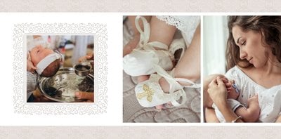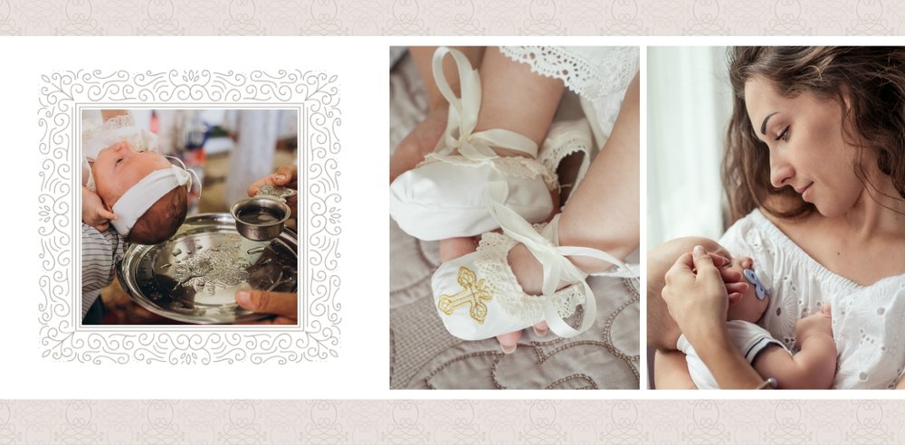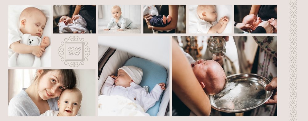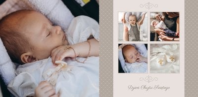 Szablon Chrzest dziecka idealnie sprawdzi się przy projektowaniu fotoksiążki dziecka upamiętniającej przyjęcie Sakramentu Chrztu Świętego. Beżowe tła idealnie skomponują się ze zdjęciami maleństwa, a dodatki w postaci ornamentów, ramek, wzorów i monogramów dodadzą projektowi elegancji. Szablon idealny na prezent dla Rodziców Chrzestnych oraz jako pamiątka Chrztu Świętego. Szablon Chrzest dziecka tworzy serię razem z szablonami Dzień Komunii Świętej oraz Dzień Ślubu.