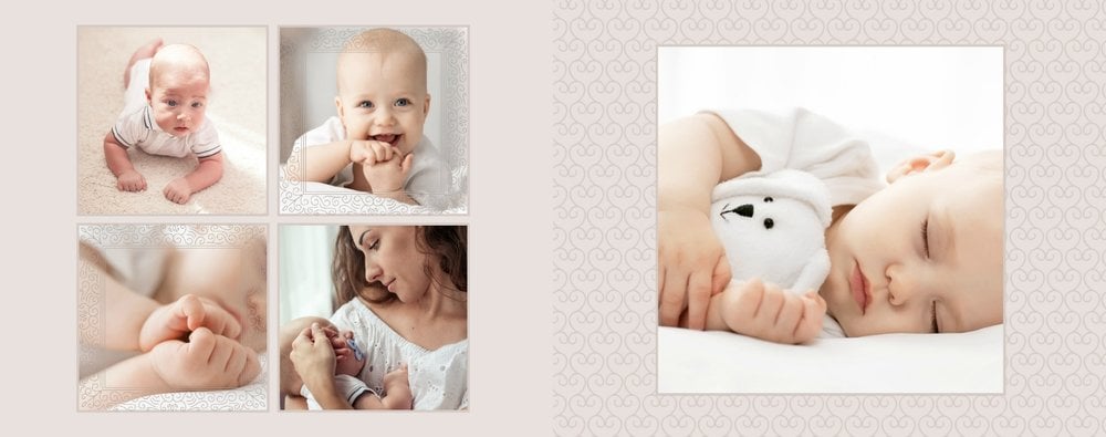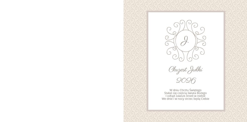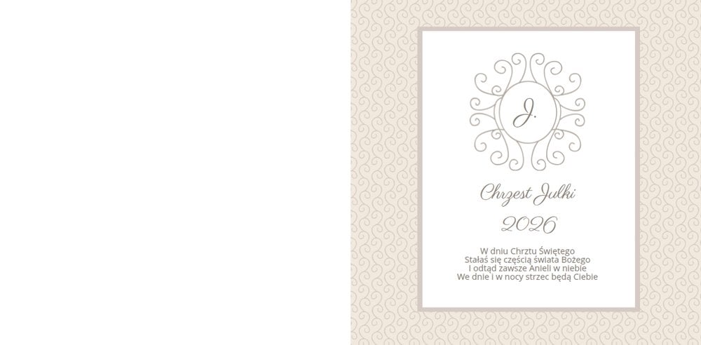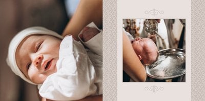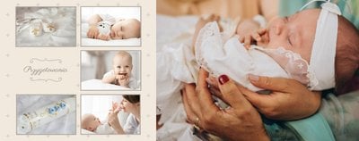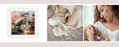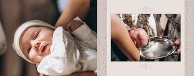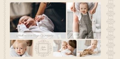 Szablon Chrzest dziecka idealnie sprawdzi się przy projektowaniu fotoksiążki dziecka upamiętniającej przyjęcie Sakramentu Chrztu Świętego. Beżowe tła idealnie skomponują się ze zdjęciami maleństwa, a dodatki w postaci ornamentów, ramek, wzorów i monogramów dodadzą projektowi elegancji. Szablon idealny na prezent dla Rodziców Chrzestnych oraz jako pamiątka Chrztu Świętego. Szablon Chrzest dziecka tworzy serię razem z szablonami Dzień Komunii Świętej oraz Dzień Ślubu.