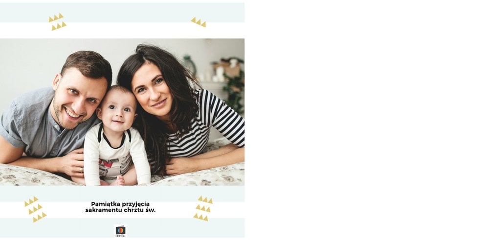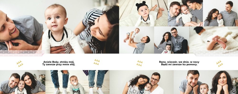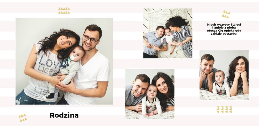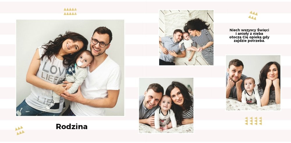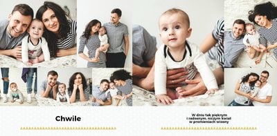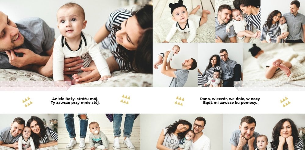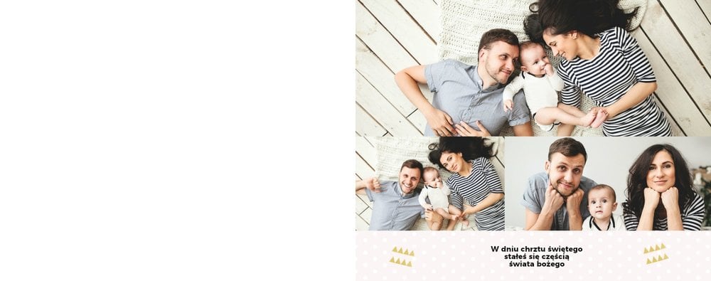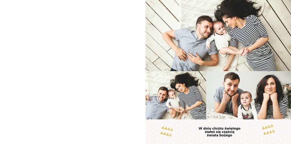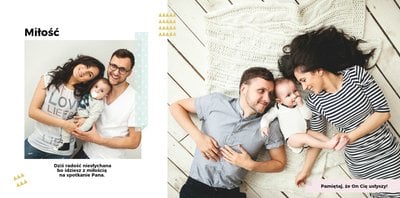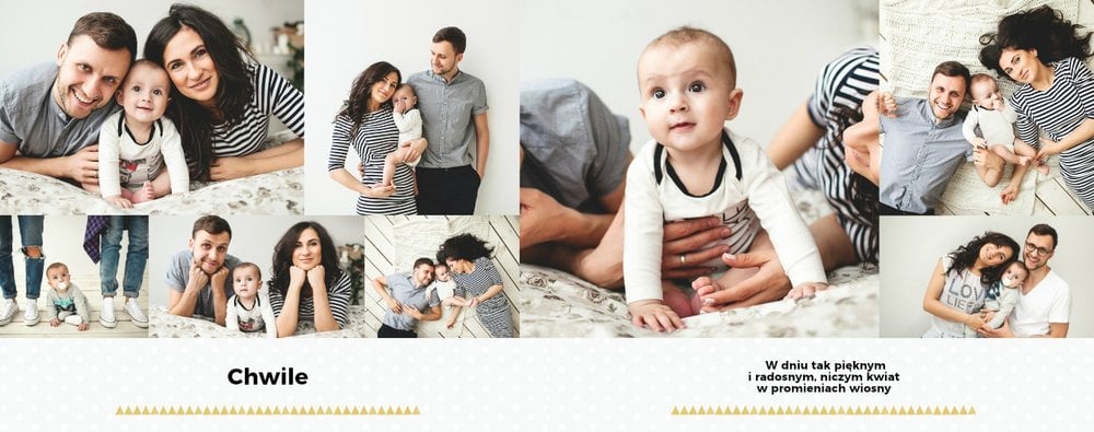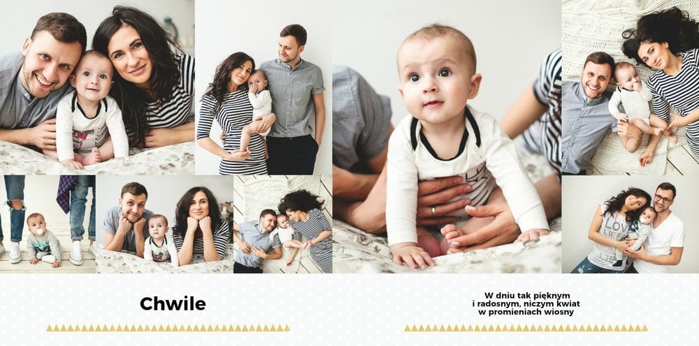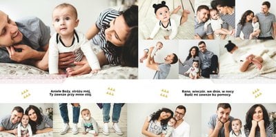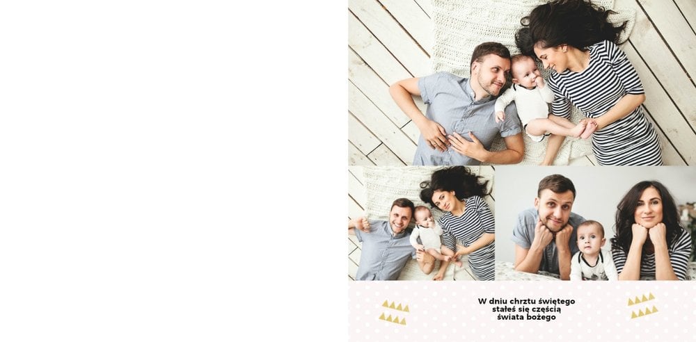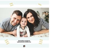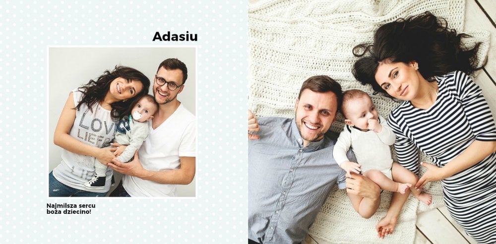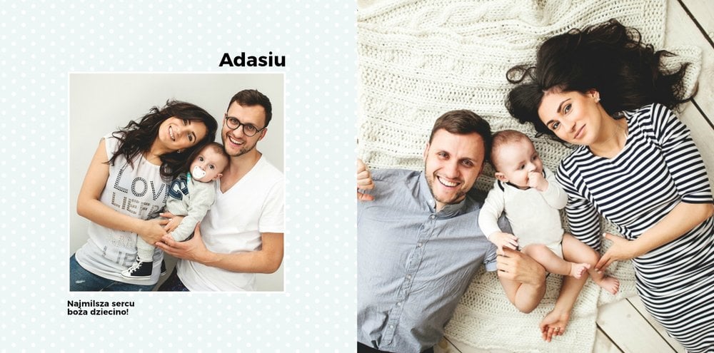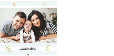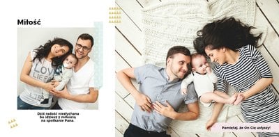 Bez wątpienia chrzest jest bardzo ważnym wydarzeniem w życiu całej rodziny, dlatego powinien pozostać w pamięci najbliższych na zawsze. Fotoksiążka z szablonem Chrzest Święty to dobry pomysł na zebranie najpiękniejszych zdjęć z wielkiego dnia i podarowania w postaci fotoksiążki. Wszystkie wspomnienia zamknięte w nowoczesnym szablonie z nietypową czcionką sprawdzą się jako długoletnia, rodzinna pamiątka. Wewnątrz szablonu znajdziesz mnóstwo miejsca na zdjęcia z uroczystości, jak i na pozostałe zdjęcia Twojego malucha.