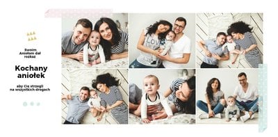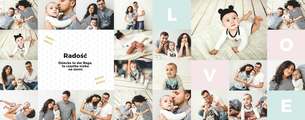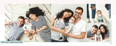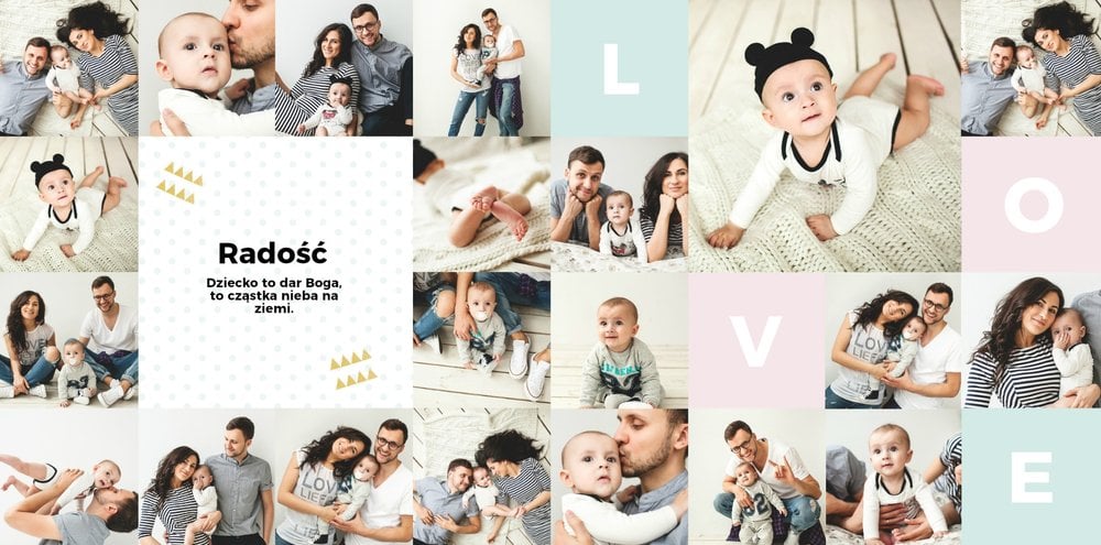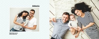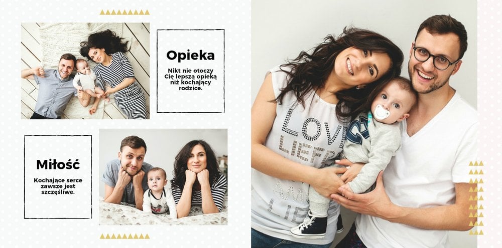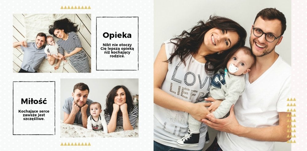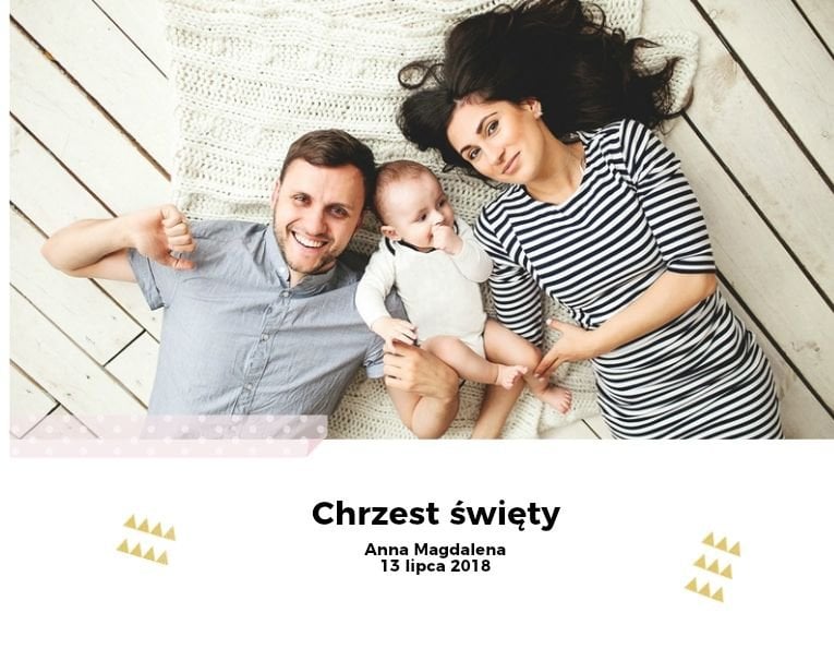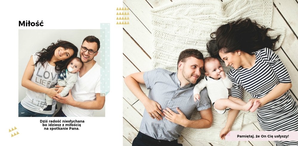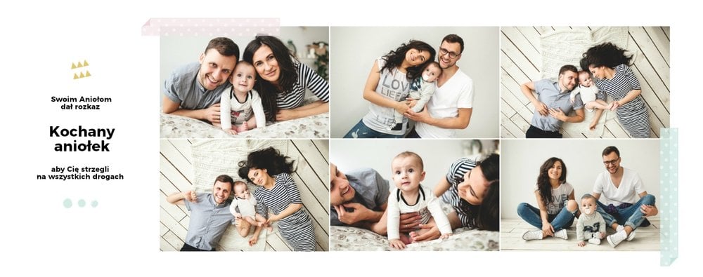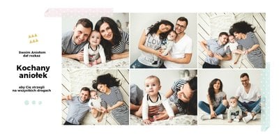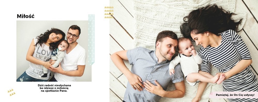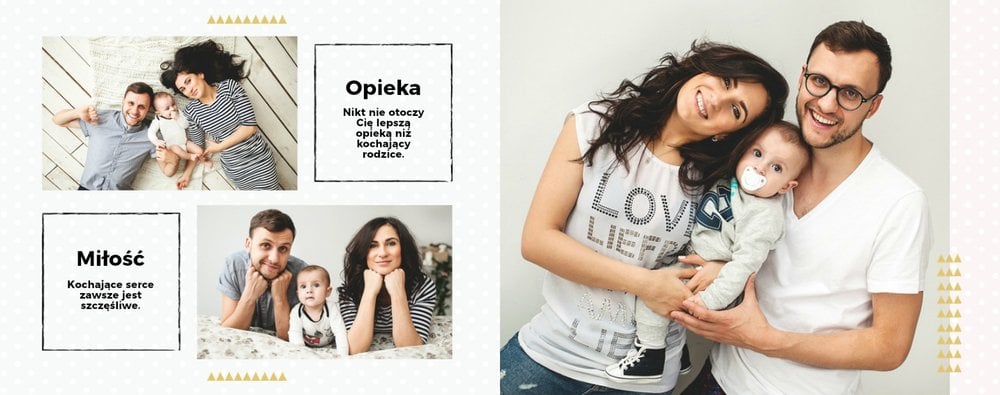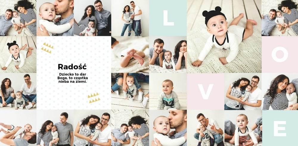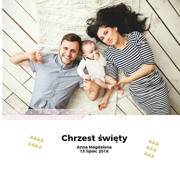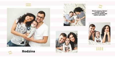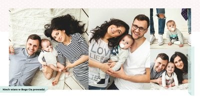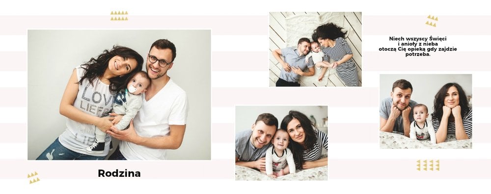Bez wątpienia chrzest jest bardzo ważnym wydarzeniem w życiu całej rodziny, dlatego powinien pozostać w pamięci najbliższych na zawsze. Fotoksiążka z szablonem Chrzest Święty to dobry pomysł na zebranie najpiękniejszych zdjęć z wielkiego dnia i podarowania w postaci fotoksiążki. Wszystkie wspomnienia zamknięte w nowoczesnym szablonie z nietypową czcionką sprawdzą się jako długoletnia, rodzinna pamiątka. Wewnątrz szablonu znajdziesz mnóstwo miejsca na zdjęcia z uroczystości, jak i na pozostałe zdjęcia Twojego malucha.