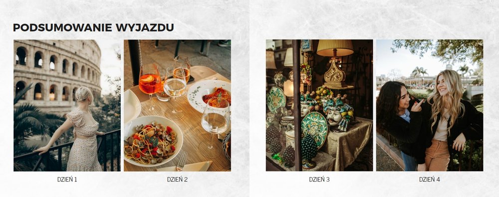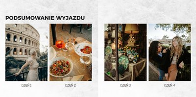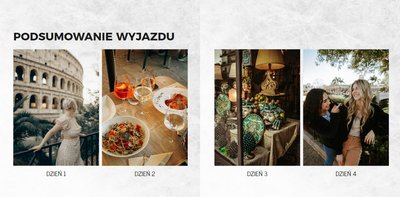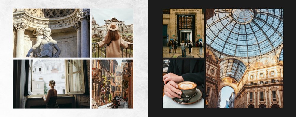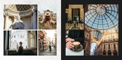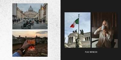 Fotoksiążka City Break - Rzym została zaprojektowana w duchu prostoty i miejskiego stylu. Zielone kolory okładki nawiązujące do zielonego odcienia na włoskiej fladze idealnie podkreślą zdjęcia robione na tle klimatycznych, włoskich uliczek i budynków. W środku natomiast królują czerń, szarość i biel, które będą pasować do każdej miejskiej fotografii. Minimalistyczny design oraz prostota układu komórek zdjęciowych sprawdzą się idealnie przy ogromnej ilości zdjęć, robionych podczas weekendowego wypadu.