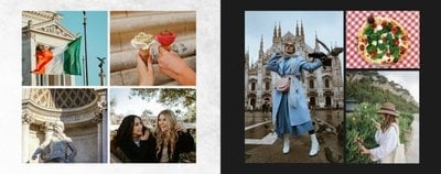 Fotoksiążka City Break - Rzym została zaprojektowana w duchu prostoty i miejskiego stylu. Zielone kolory okładki nawiązujące do zielonego odcienia na włoskiej fladze idealnie podkreślą zdjęcia robione na tle klimatycznych, włoskich uliczek i budynków. W środku natomiast królują czerń, szarość i biel, które będą pasować do każdej miejskiej fotografii. Minimalistyczny design oraz prostota układu komórek zdjęciowych sprawdzą się idealnie przy ogromnej ilości zdjęć, robionych podczas weekendowego wypadu.