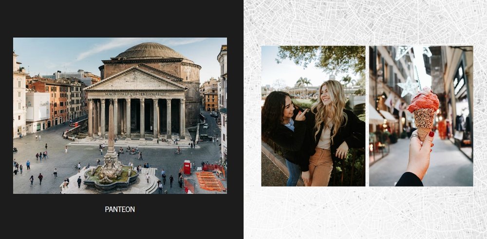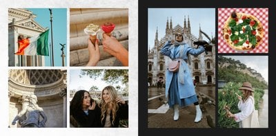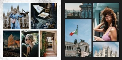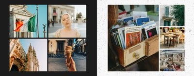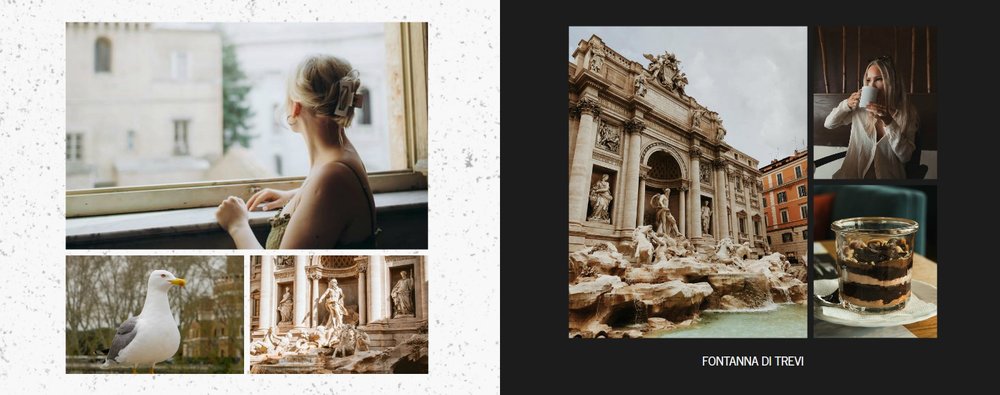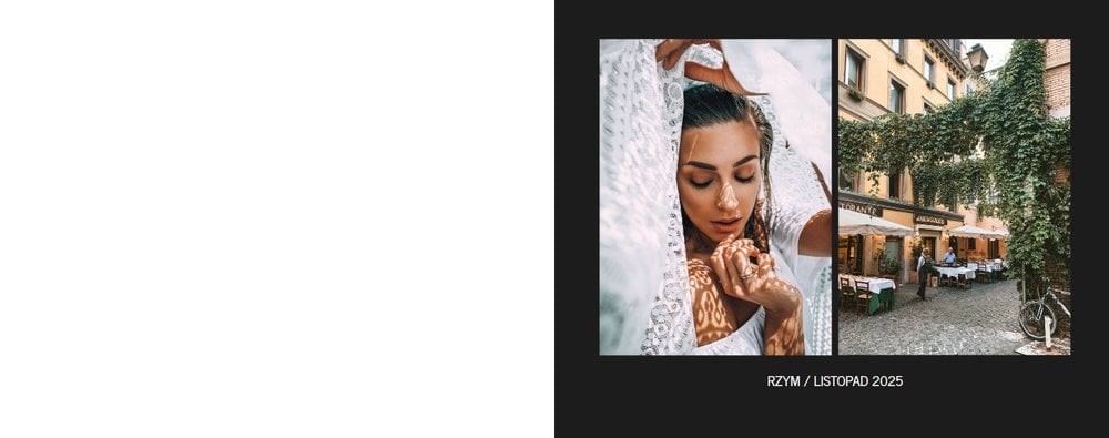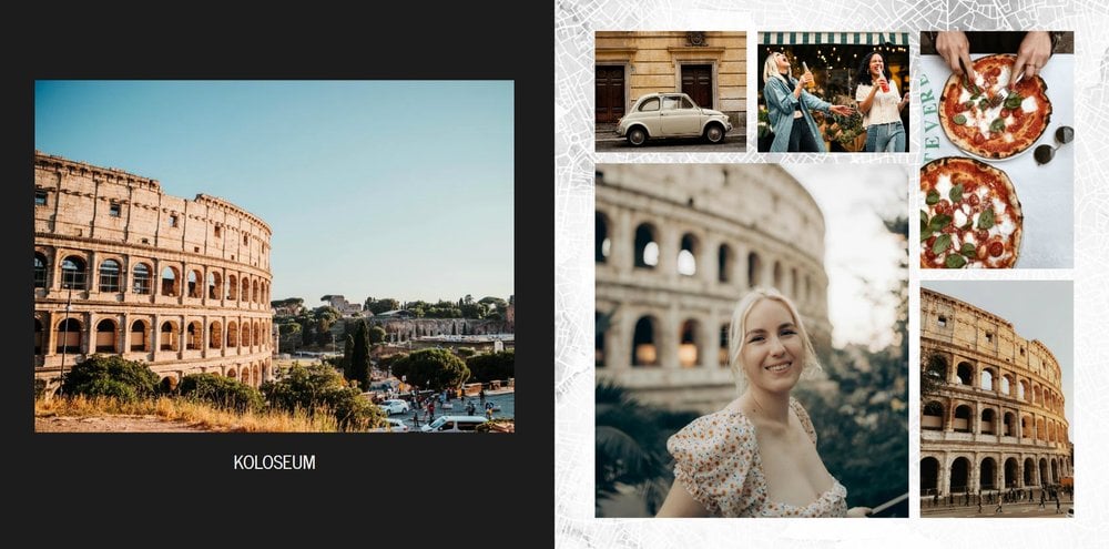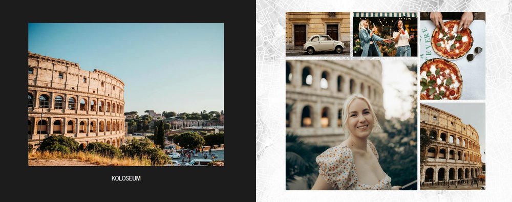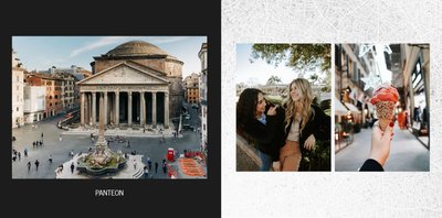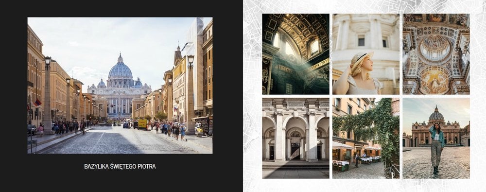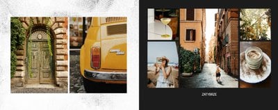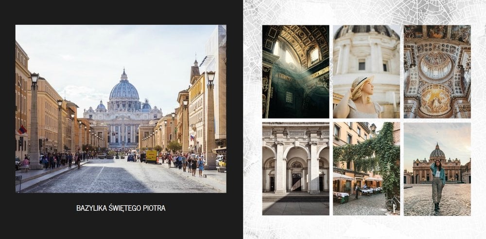 Fotoksiążka City Break - Rzym została zaprojektowana w duchu prostoty i miejskiego stylu. Zielone kolory okładki nawiązujące do zielonego odcienia na włoskiej fladze idealnie podkreślą zdjęcia robione na tle klimatycznych, włoskich uliczek i budynków. W środku natomiast królują czerń, szarość i biel, które będą pasować do każdej miejskiej fotografii. Minimalistyczny design oraz prostota układu komórek zdjęciowych sprawdzą się idealnie przy ogromnej ilości zdjęć, robionych podczas weekendowego wypadu.