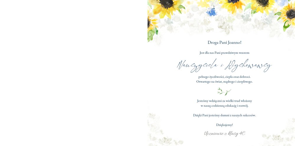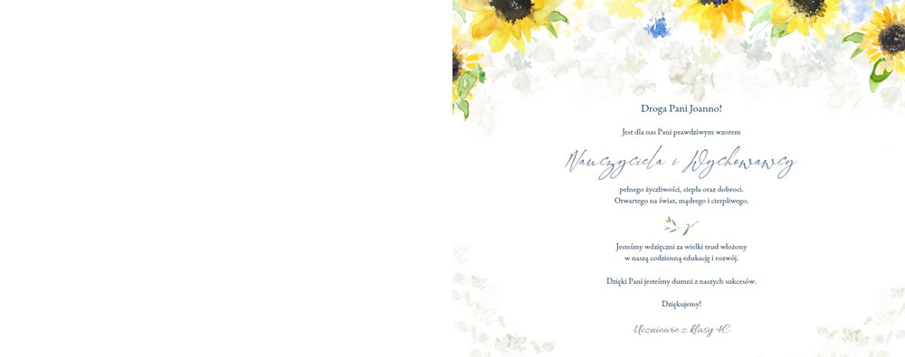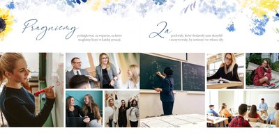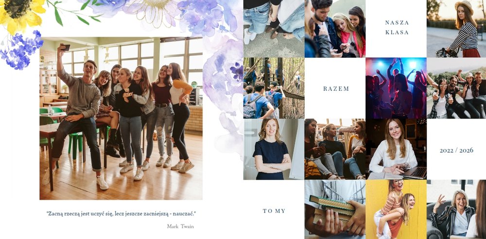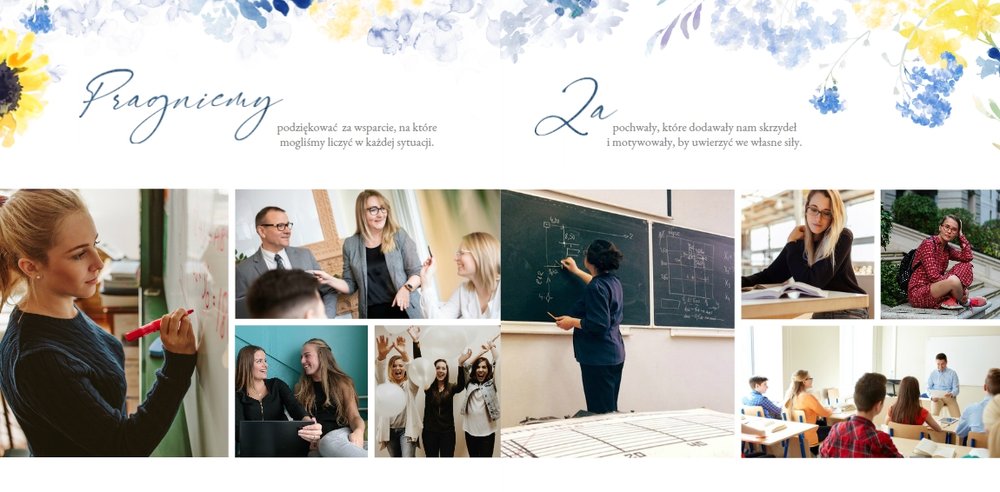 Szablon fotoksiążki "Dla najlepszego wychowawcy" to elegancki i pełen kwiatowych akcentów projekt graficzny, który zawiera miejsca na najlepsze szkolne ujęcia, dedykacje, słowa wdzięczności i odręczne podpisy wszystkich uczniów. Wewnątrz znajdziesz także miejsce na galerię zdjęć wszystkich uczniów!