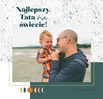 Szablon "Dla Super Taty" to propozycja, w której przeważającym kolorem jest biel, uzupełniona o zielono-niebieskie akcenty i mozaiki - dzięki nim całość nabiera nietypowego charakteru. Oprócz tego szablon zdobią elementy graficzne w kolorze złota. Całość dopełniają czcionki i ciekawe układy komórek na Twoje zdjęcia.