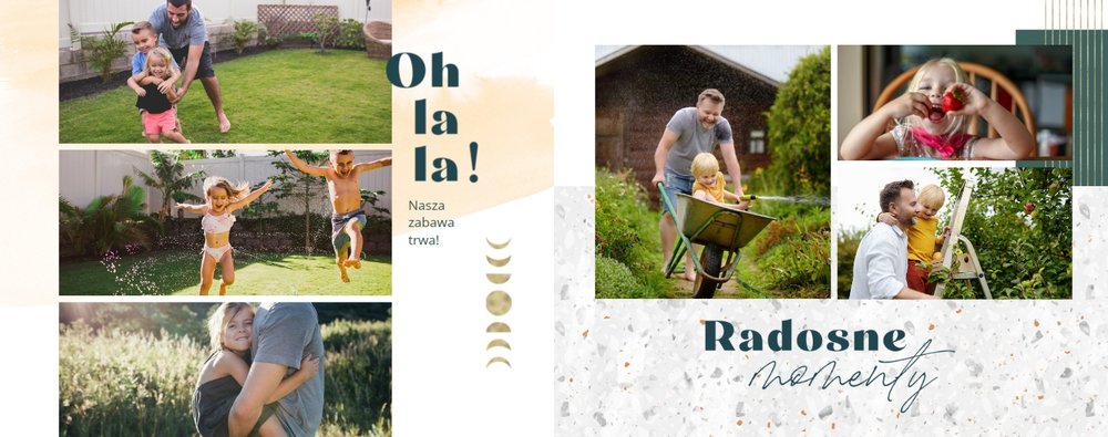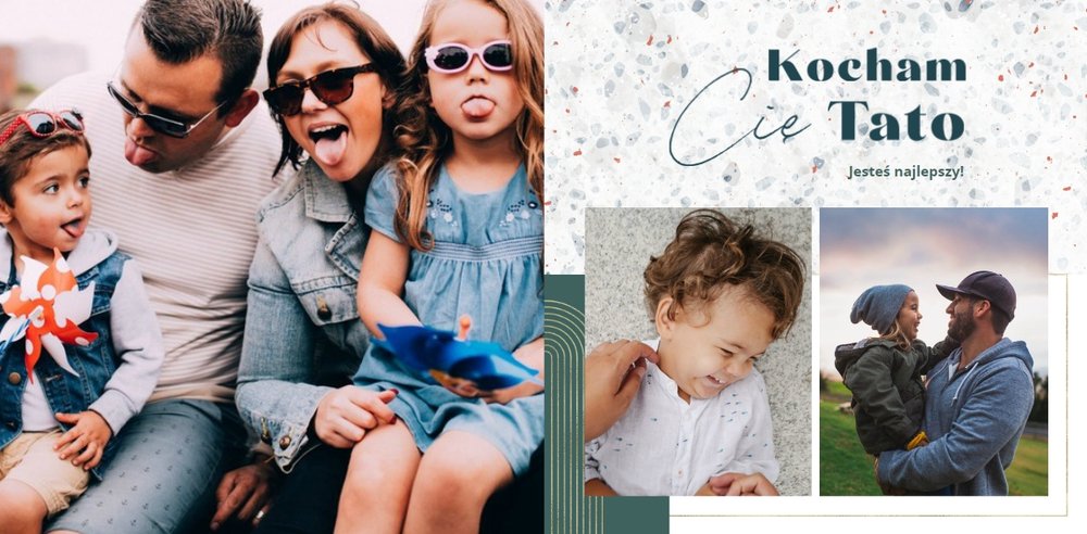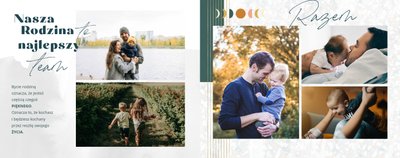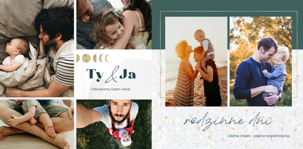 Szablon "Dla Super Taty" to propozycja, w której przeważającym kolorem jest biel, uzupełniona o zielono-niebieskie akcenty i mozaiki - dzięki nim całość nabiera nietypowego charakteru. Oprócz tego szablon zdobią elementy graficzne w kolorze złota. Całość dopełniają czcionki i ciekawe układy komórek na Twoje zdjęcia.