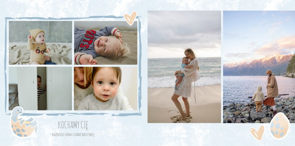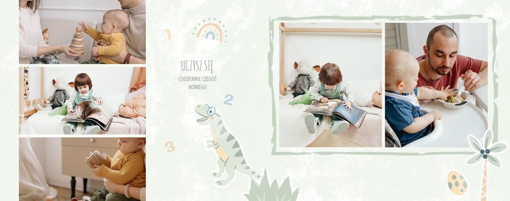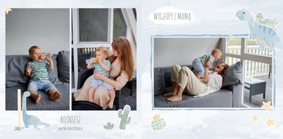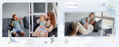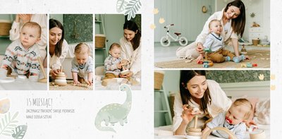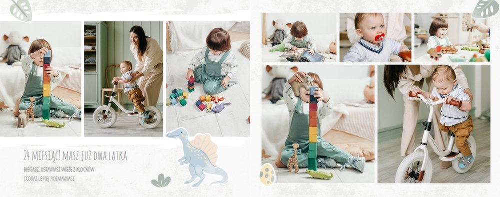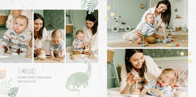 Spraw swojemu dziecku niezapomnianą pamiątkę z jego najpiękniejszych lat. Szablon fotoksiążki "Drugi rok synka" został stworzony z myślą dla wszystkich małych wielbicieli dinozaurów. Kolorowe tła - głównie w odcieniach zieleni i błękitu - podkreślą każde zdjęcie Twojego dziecka, a dinusiowe ilustracje dodadzą uroku i zachęcą do częstego wracania do wspomnień. Z tak przygotowaną fotoksiążką zachowasz najcenniejsze wspomnienia swojego dziecka na lata.