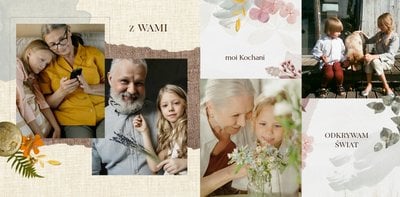 Fotoksiążka "Dzień Babci i Dziadka" zaprojektowana została w tradycyjnym, ozdobnym stylu, nawiązującym do naturalnych elementów oraz swojskich klimatów. Elementy graficzne - takie jak kwiaty, stemple, kawałki pergaminu czy woskowe pieczęcie - podkreślą urok każdego zdjęcia z Babcią i Dziadkiem. Specjalnie dobrana paleta kolorów, składająca się z zieleni, brudnego różu, beży i brązów, nada całości wyjątkowy charakter.