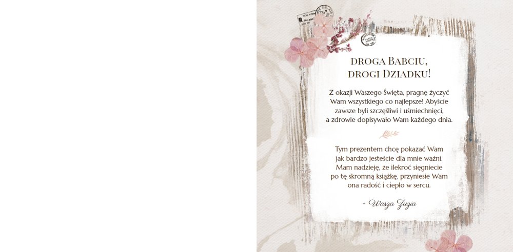 Fotoksiążka "Dzień Babci i Dziadka" zaprojektowana została w tradycyjnym, ozdobnym stylu, nawiązującym do naturalnych elementów oraz swojskich klimatów. Elementy graficzne - takie jak kwiaty, stemple, kawałki pergaminu czy woskowe pieczęcie - podkreślą urok każdego zdjęcia z Babcią i Dziadkiem. Specjalnie dobrana paleta kolorów, składająca się z zieleni, brudnego różu, beży i brązów, nada całości wyjątkowy charakter.