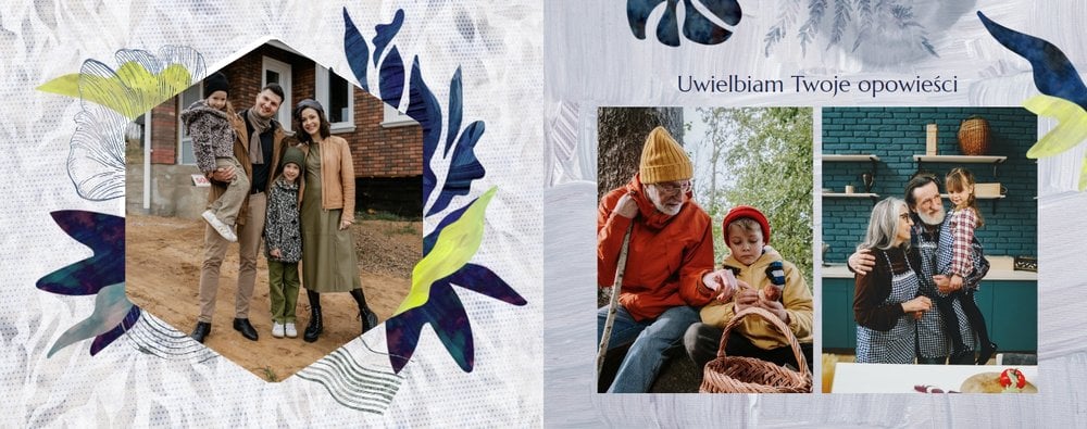 Z szablonem fotoksiążki "Dzień Dziadka" wyczarujesz niezwykły prezent, pełen najbardziej wyjątkowych wspomnień. Nowoczesny design z subtelnymi elementami florystycznymi, zachowany w chłodnej kolorystyce, zachwyci każdego mężczyznę. Skorzystaj z gotowego szablonu i wypełnij rozkładówki uroczymi zdjęciami Twojego malucha lub edytuj wewnętrzne strony fotoksiążki według własnego pomysłu. Możesz dostosować liczbę stron, układ komórek zdjęciowych, elementy ozdobne oraz treść. W imieniu dziecka wręcz swojemu Tacie lub Teściowi najpiękniejszy prezent z okazji ich styczniowego święta.