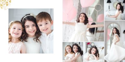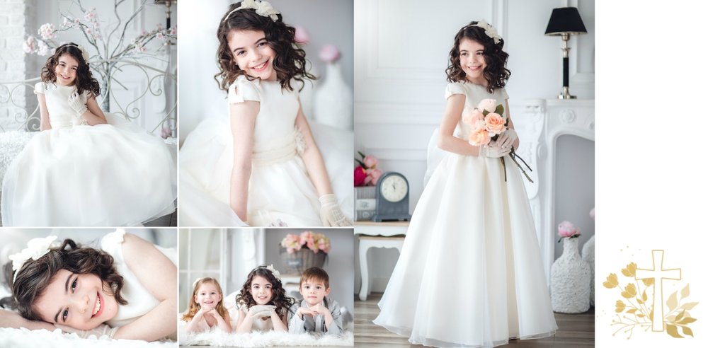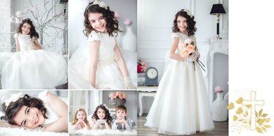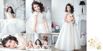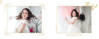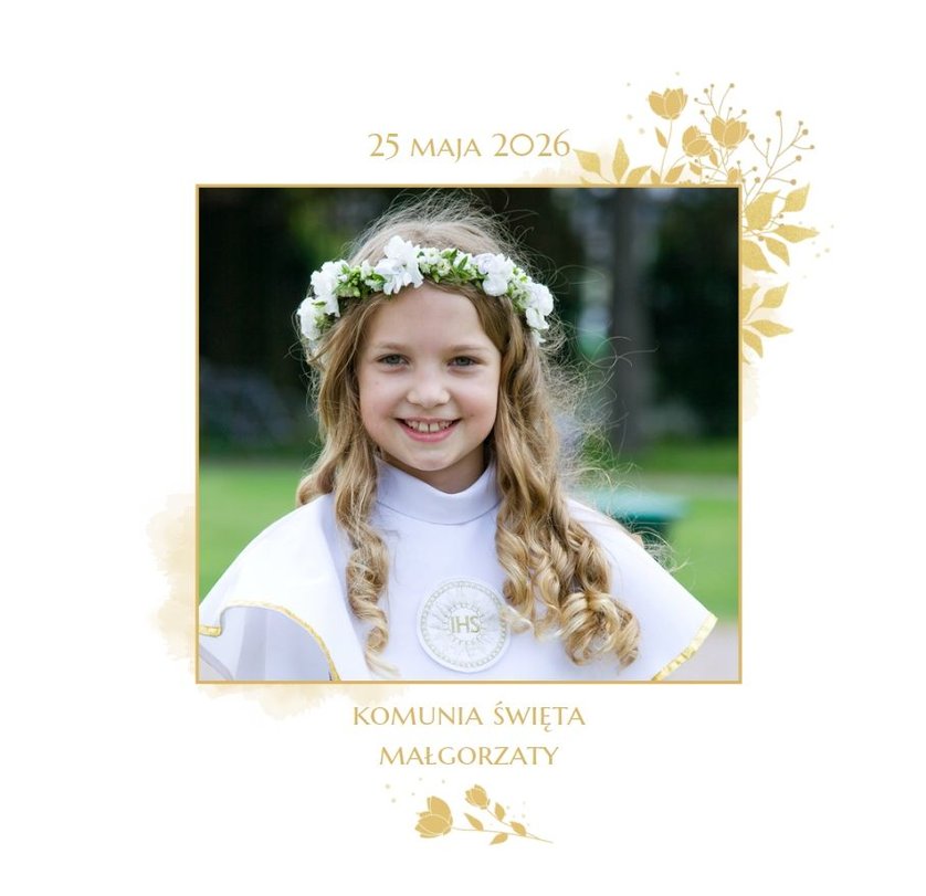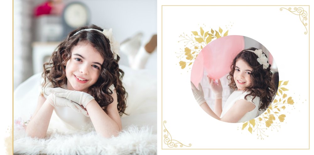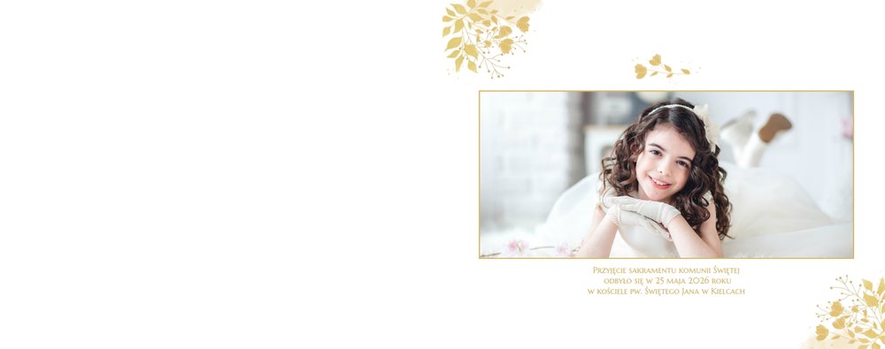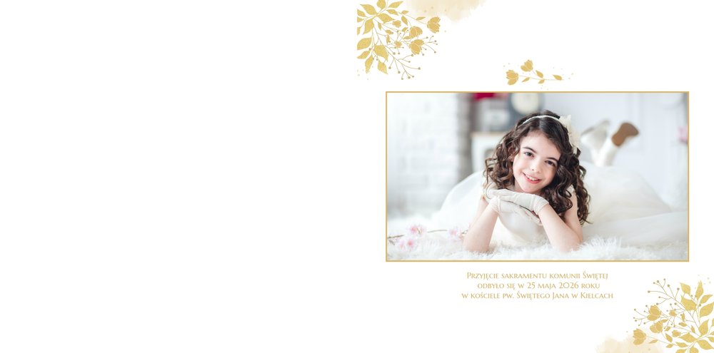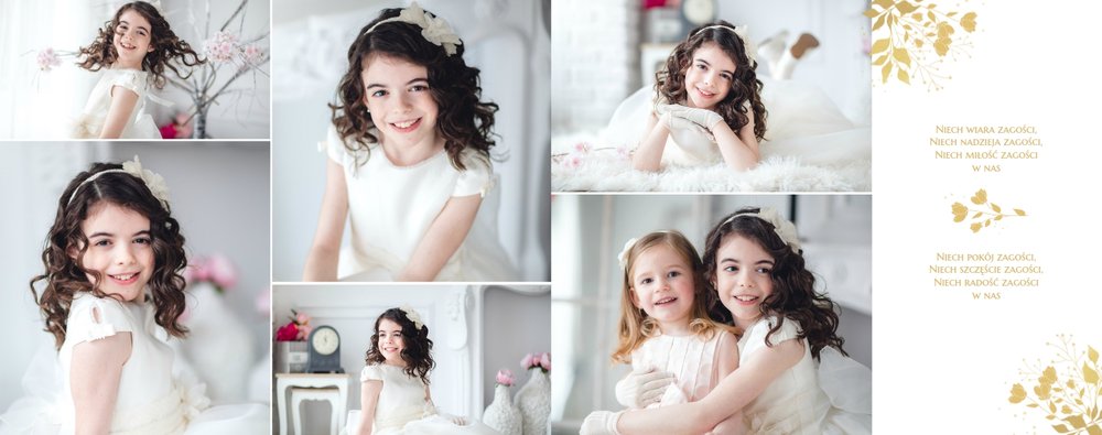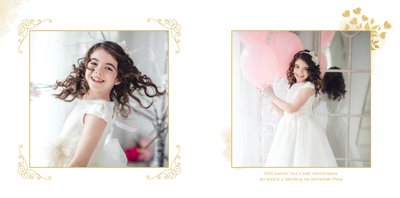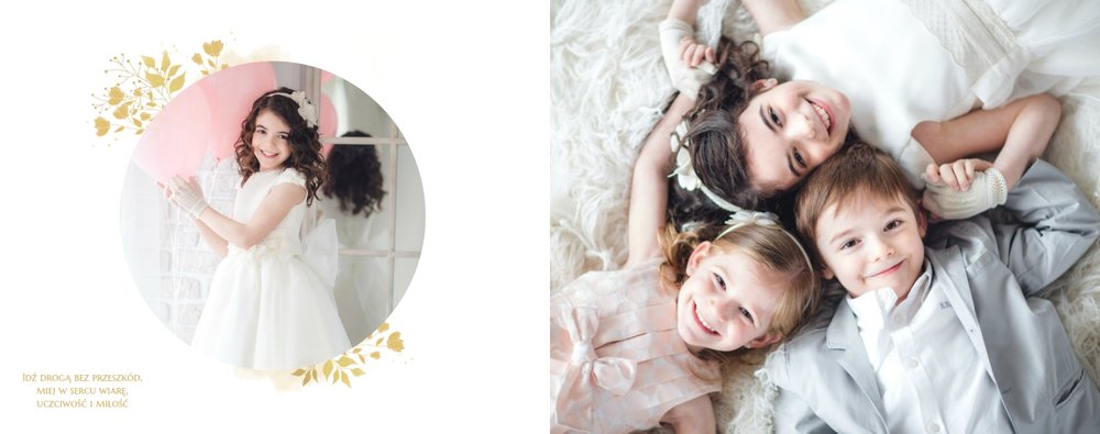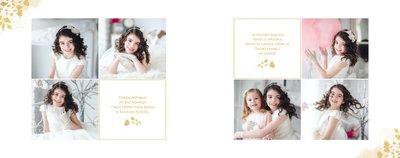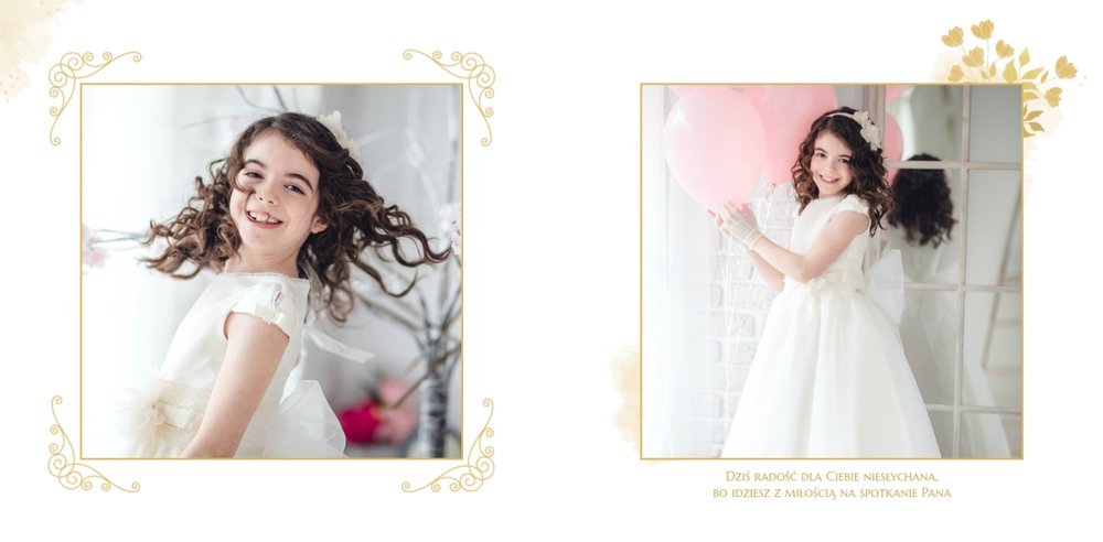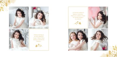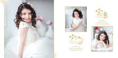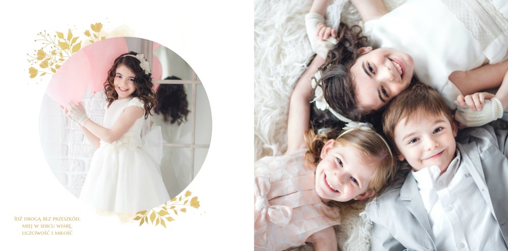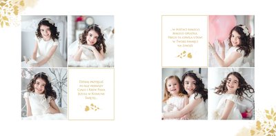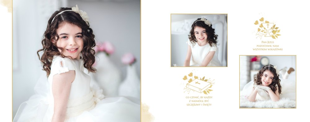 Jeśli pragniesz stworzyć fotoksiążkę upamiętniającą przyjęcie Sakramentu Pierwszej Komunii Świętej to idealnie w tej roli spełni się szablon Dzień Komunii Świętej. Dzięki niemu zaprojektujesz wyjątkową fotopamiątkę z jednego z najważniejszych dni w życiu Dziecka. Całość szablonu utrzymana jest w bieli z nutą złotych elementów graficznych. Jego minimalistyczna i elegancka forma sprawia, że zdjęcia stają się najważniejsze. Na stronach znajdziesz także komunijne sentencje. Wystarczy, że szablon uzupełnisz o informacje i fotografie.