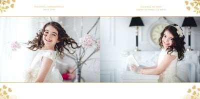 Jeśli pragniesz stworzyć fotoksiążkę upamiętniającą przyjęcie Sakramentu Pierwszej Komunii Świętej to idealnie w tej roli spełni się szablon Dzień Komunii Świętej. Dzięki niemu zaprojektujesz wyjątkową fotopamiątkę z jednego z najważniejszych dni w życiu Dziecka. Całość szablonu utrzymana jest w bieli z nutą złotych elementów graficznych. Jego minimalistyczna i elegancka forma sprawia, że zdjęcia stają się najważniejsze. Na stronach znajdziesz także komunijne sentencje. Wystarczy, że szablon uzupełnisz o informacje i fotografie.