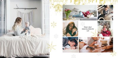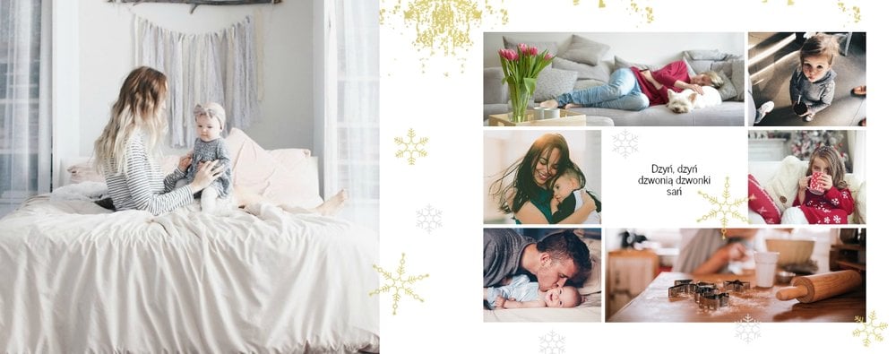 Dzyń, dzyń dzwonią dzwonki sań.. Z szablonem "Dzyń, dzyń" zaprojektujesz fotoksiążkę, która idealnie sprawdzi się w roli prezentu świątecznego dla Ciebie lub Twoich bliskich. Zadbaj o fotograficzne wspomnienia i zachowaj je na dłużej w szablonie przepełnionym delikatnym tłem oraz błyszczącymi dodatkami. Świąteczny klimat szablonu utrzymując świąteczne i zimowe akcenty.