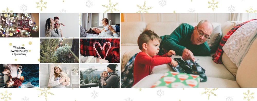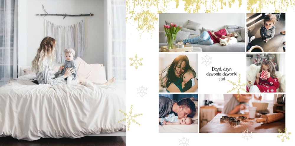 Dzyń, dzyń dzwonią dzwonki sań.. Z szablonem "Dzyń, dzyń" zaprojektujesz fotoksiążkę, która idealnie sprawdzi się w roli prezentu świątecznego dla Ciebie lub Twoich bliskich. Zadbaj o fotograficzne wspomnienia i zachowaj je na dłużej w szablonie przepełnionym delikatnym tłem oraz błyszczącymi dodatkami. Świąteczny klimat szablonu utrzymując świąteczne i zimowe akcenty.