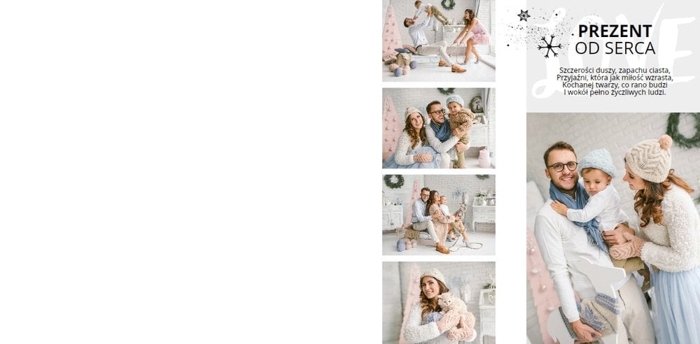 Świąteczne życzenia to szablon, z którym zaprojektujesz idealny prezent świąteczny dla bliskiej Ci osoby. Niesamowita grafika, która tworzy magiczny klimat, oryginalne życzenia świąteczne i mnóstwo miejsca na rodzinne zdjęcia sprawią, że fotoksiążka z tym szablonem stanie się pięknym prezentem świątecznym. Taka książka pozostanie wyjątkową pamiątką na długi, długi czas.