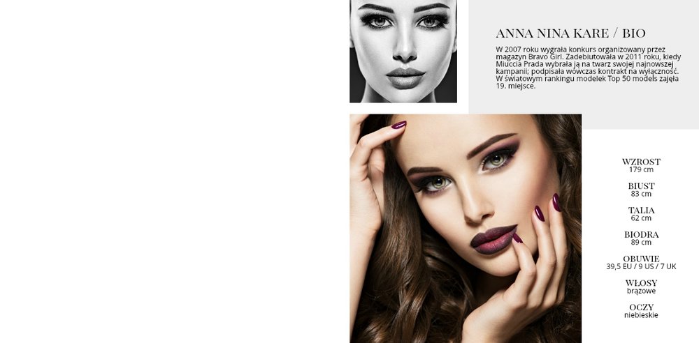 Katalog modelki to szablon, z którym stworzysz oryginalne portfolio modelki. Wybierz najważniejsze zdjęcia i najważniejsze kampanie, w których brałaś udział. Dzięki budowie szablonu, jego specjalnym układom zdjęć i miejscom na opisy, stworzysz profesjonalne portfolio, które będzie pomocne przy Twojej dalszej karierze modelki.