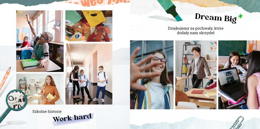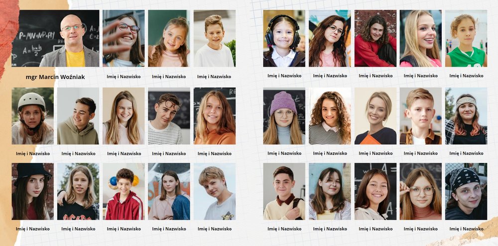 Design szablonu stanowi połączenie oldschoolowych szkolnych symboli z nowoczesną gamą kolorystyczną i ciekawymi fakturami. Kompozycje poszczególnych stron szablonu uwzględniają umieszczenie zdjęć każdego ucznia, ale również Nauczyciela. Pierwsza strona szablonu poświęcona jest kilku słowom uznania i życzeniom dla Wychowawcy. Skorzystajcie z gotowego wzoru lub umieśćcie własne wyrazy wdzięczności, które chcielibyście mu przekazać.