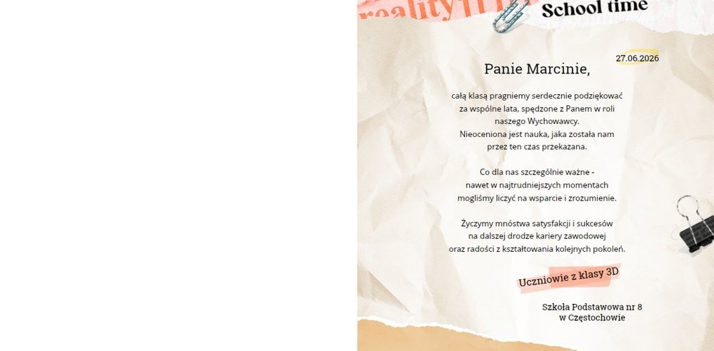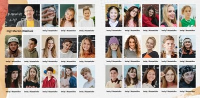 Design szablonu stanowi połączenie oldschoolowych szkolnych symboli z nowoczesną gamą kolorystyczną i ciekawymi fakturami. Kompozycje poszczególnych stron szablonu uwzględniają umieszczenie zdjęć każdego ucznia, ale również Nauczyciela. Pierwsza strona szablonu poświęcona jest kilku słowom uznania i życzeniom dla Wychowawcy. Skorzystajcie z gotowego wzoru lub umieśćcie własne wyrazy wdzięczności, które chcielibyście mu przekazać.