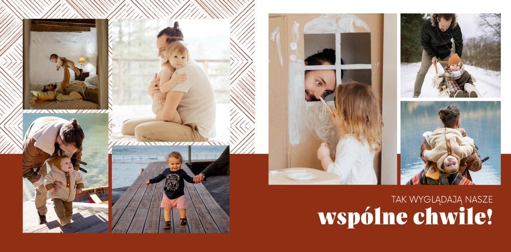 Szablon "Kocham Cię Tato" to nowoczesna propozycja aranżacji Waszych najlepszych ujęć wśród geometrycznych wzorów i krótkich tekstów. Miejsc na zdjęcia jest sporo - to one odgrywają w końcu główną rolę. Zabawne i chwytające za serce frazy stanowią uzupełnienie i podkreślenie relacji, jaka łączy Ojca z dzieckiem.