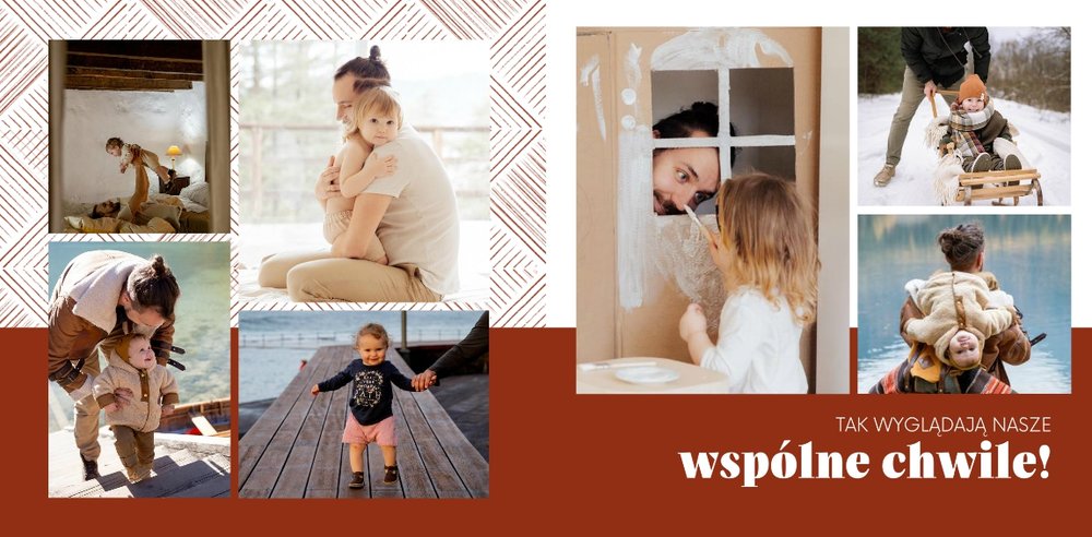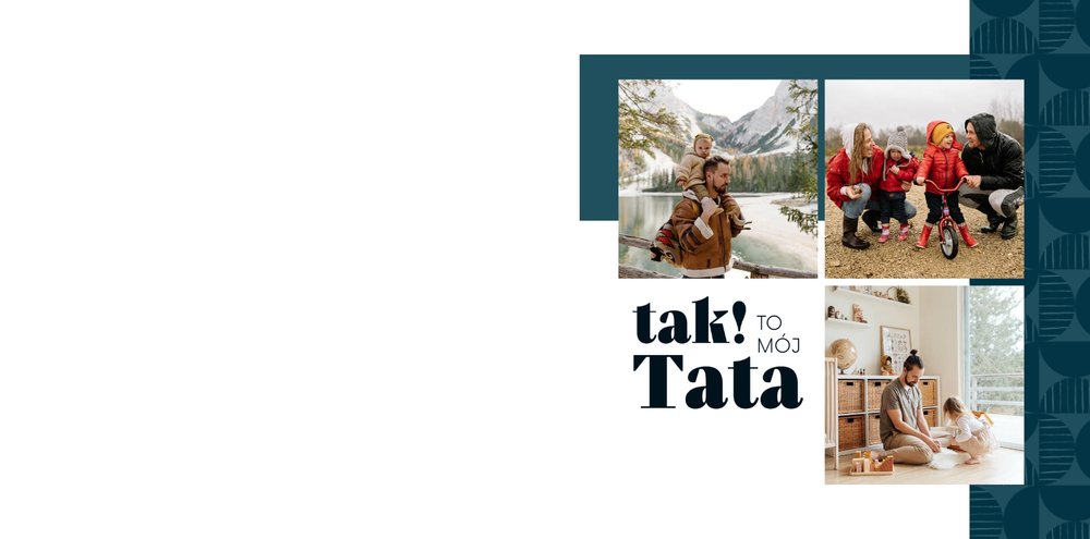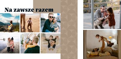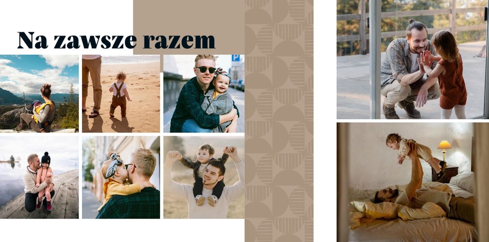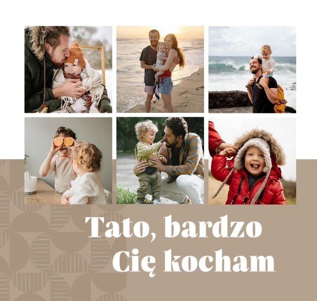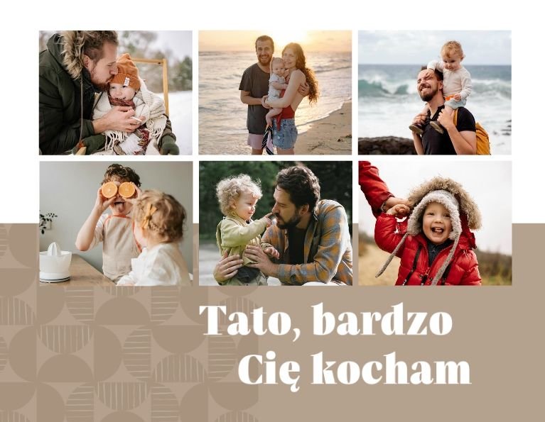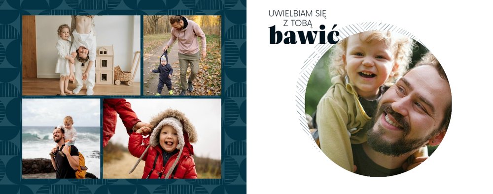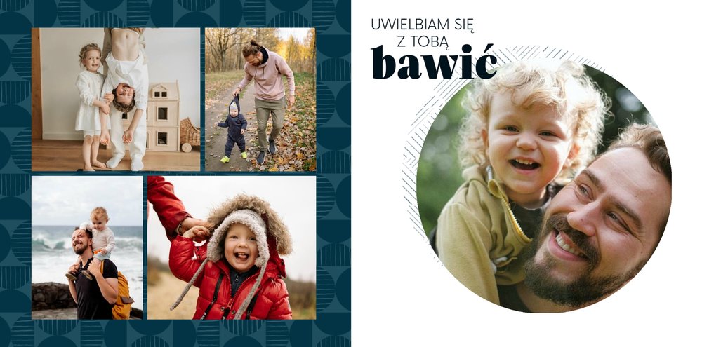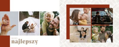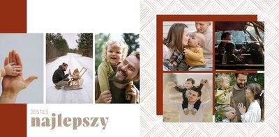 Szablon "Kocham Cię Tato" to nowoczesna propozycja aranżacji Waszych najlepszych ujęć wśród geometrycznych wzorów i krótkich tekstów. Miejsc na zdjęcia jest sporo - to one odgrywają w końcu główną rolę. Zabawne i chwytające za serce frazy stanowią uzupełnienie i podkreślenie relacji, jaka łączy Ojca z dzieckiem.