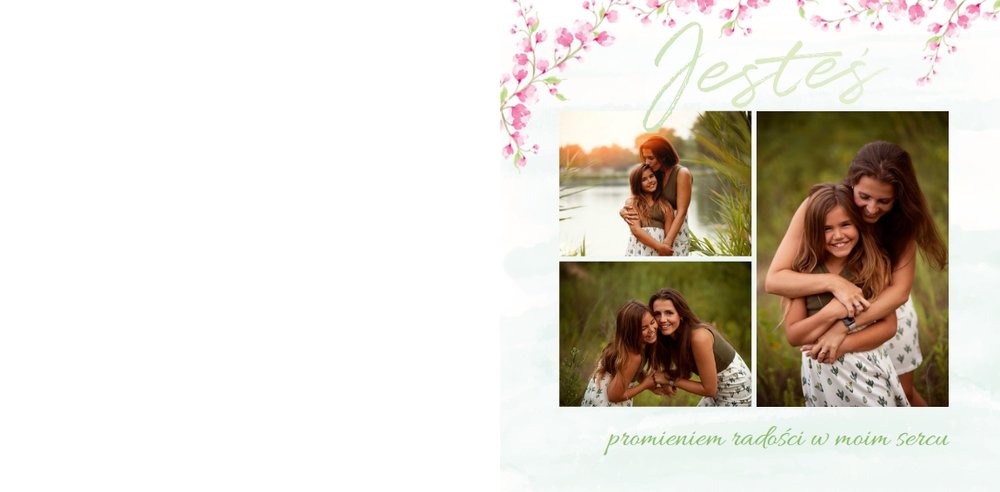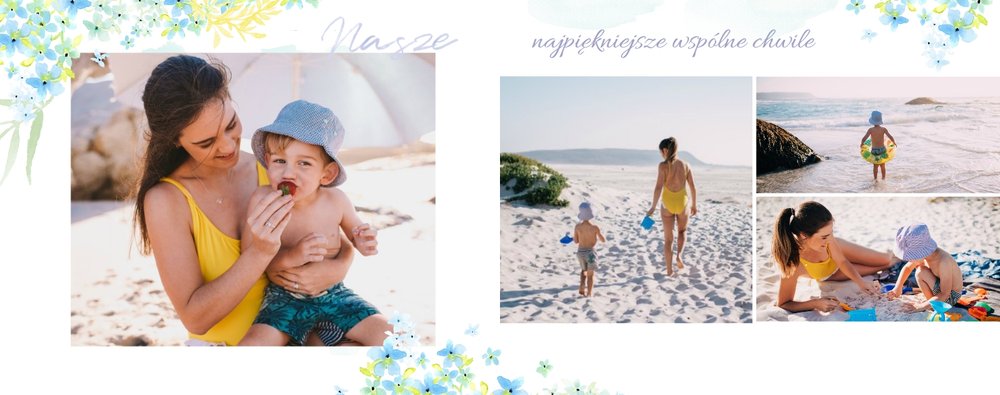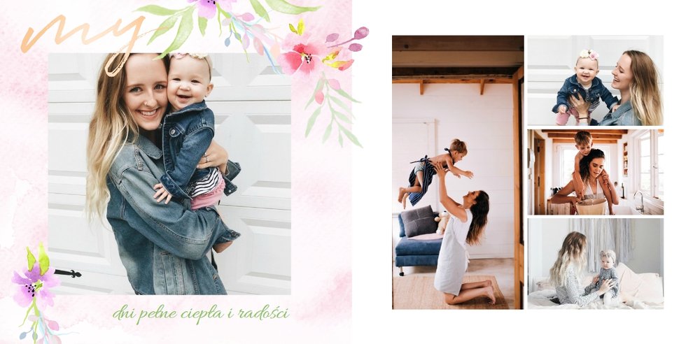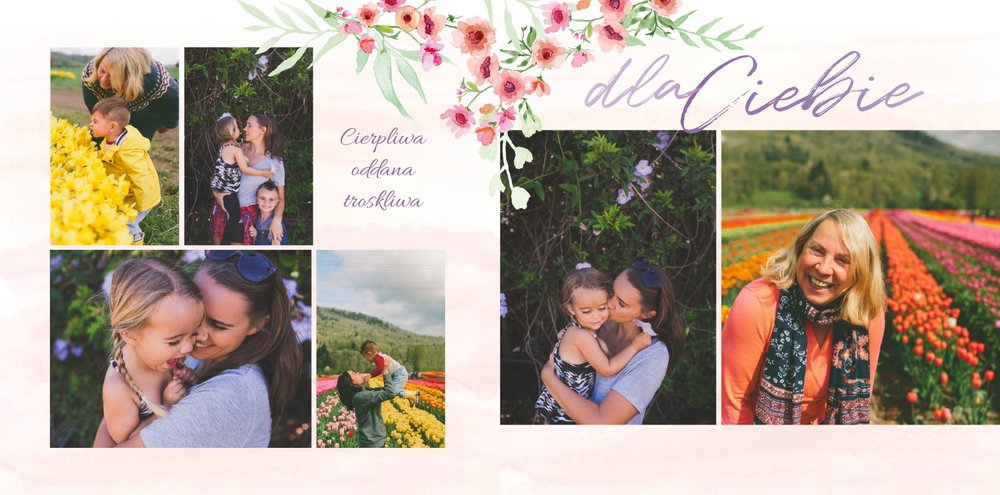 Na Dzień mamy przygotuj idealny prezent! Wybierając szablon Kochanej Mamie stworzysz oryginalną fotoksiążkę wypełnioną, nie tylko wspólnymi zdjęciami, ale także wspomnieniami! Zaprojektowanie tego prezentu zajmie Ci zaledwie kilka minut, a wzruszeniom z przeglądania nie będzie końca. Układ graficzny jest minimalistyczny, a jednocześnie przepełniony kolorem pięknych kwiatów. Szablon jest niezwykle kobiecy, zatem z pewnością spodoba się każdej Mamie. Na stronach możesz zamieścić życzenia, a ramki wypełnić o wspólne fotografie.