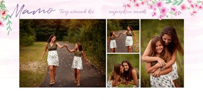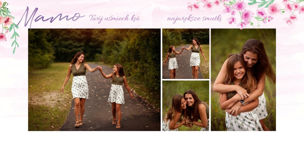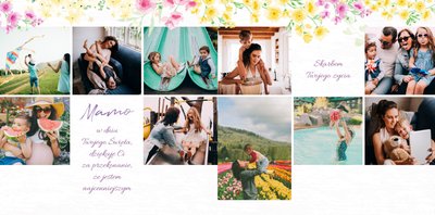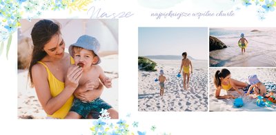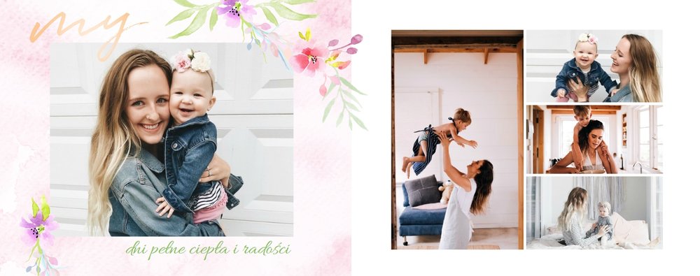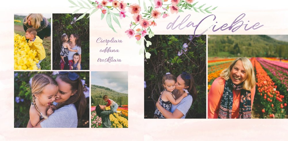 Na Dzień mamy przygotuj idealny prezent! Wybierając szablon Kochanej Mamie stworzysz oryginalną fotoksiążkę wypełnioną, nie tylko wspólnymi zdjęciami, ale także wspomnieniami! Zaprojektowanie tego prezentu zajmie Ci zaledwie kilka minut, a wzruszeniom z przeglądania nie będzie końca. Układ graficzny jest minimalistyczny, a jednocześnie przepełniony kolorem pięknych kwiatów. Szablon jest niezwykle kobiecy, zatem z pewnością spodoba się każdej Mamie. Na stronach możesz zamieścić życzenia, a ramki wypełnić o wspólne fotografie.