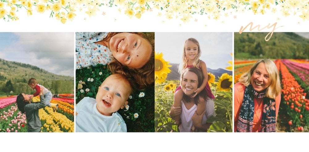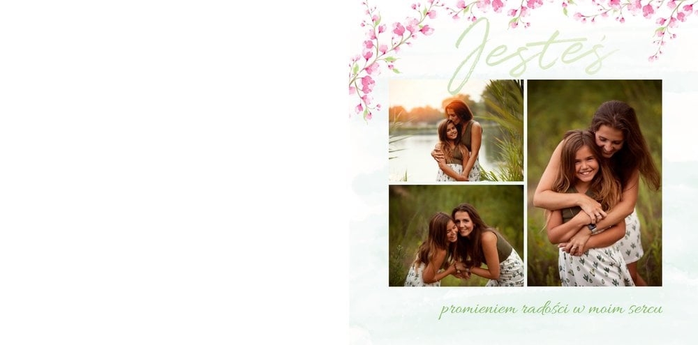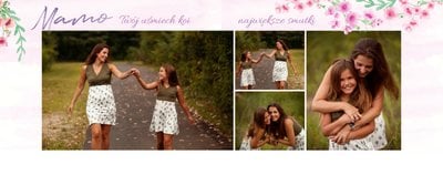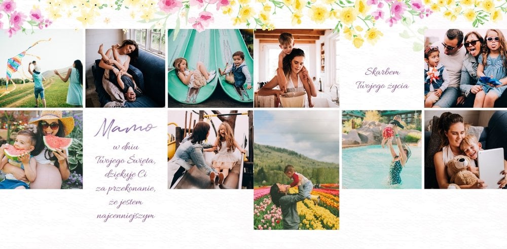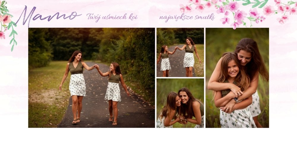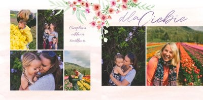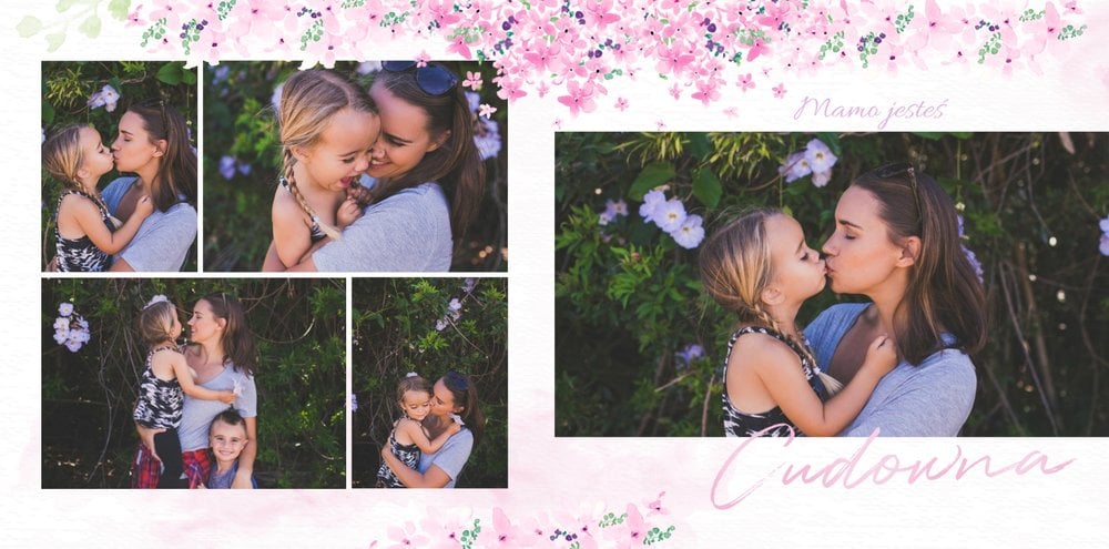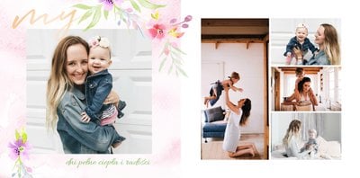 Na Dzień mamy przygotuj idealny prezent! Wybierając szablon Kochanej Mamie stworzysz oryginalną fotoksiążkę wypełnioną, nie tylko wspólnymi zdjęciami, ale także wspomnieniami! Zaprojektowanie tego prezentu zajmie Ci zaledwie kilka minut, a wzruszeniom z przeglądania nie będzie końca. Układ graficzny jest minimalistyczny, a jednocześnie przepełniony kolorem pięknych kwiatów. Szablon jest niezwykle kobiecy, zatem z pewnością spodoba się każdej Mamie. Na stronach możesz zamieścić życzenia, a ramki wypełnić o wspólne fotografie.