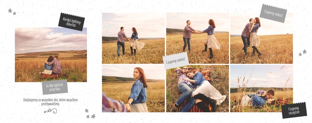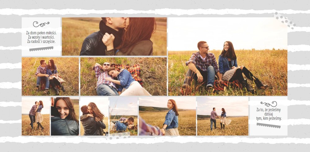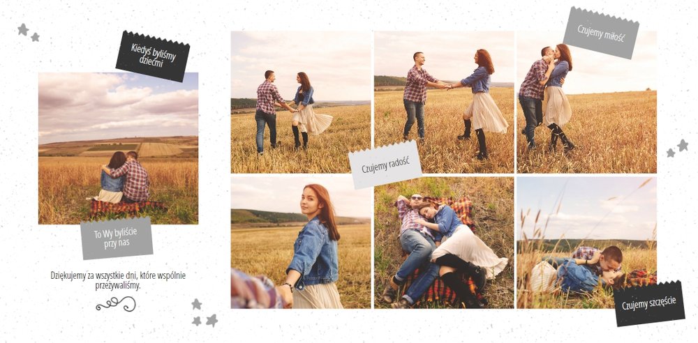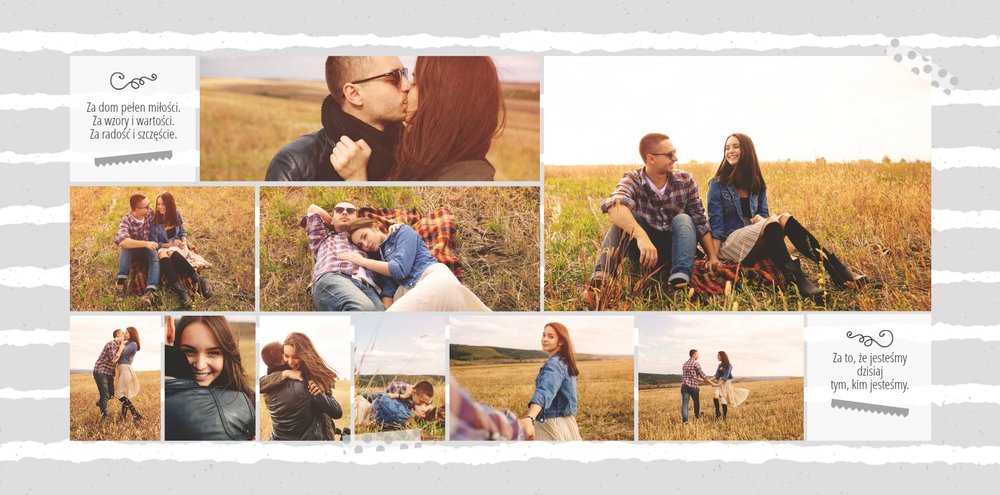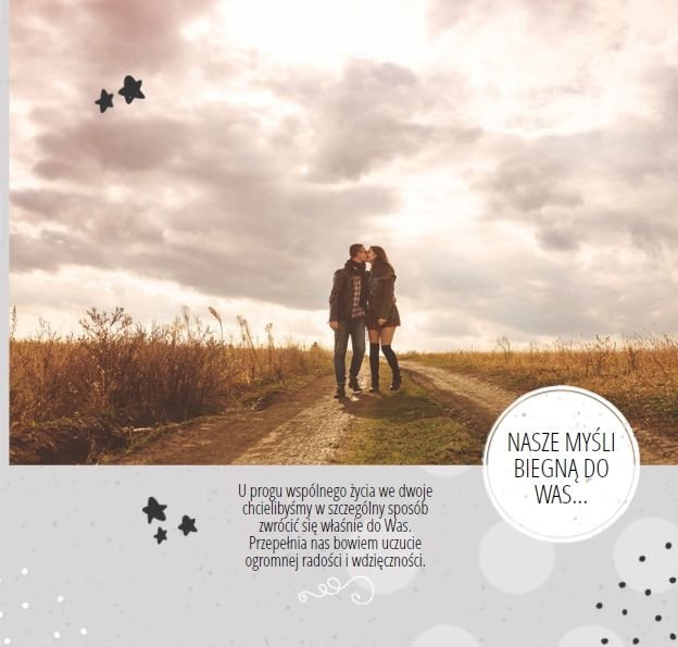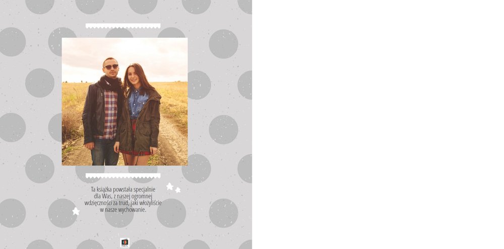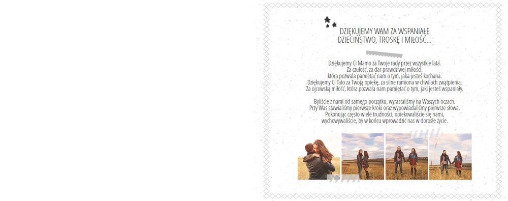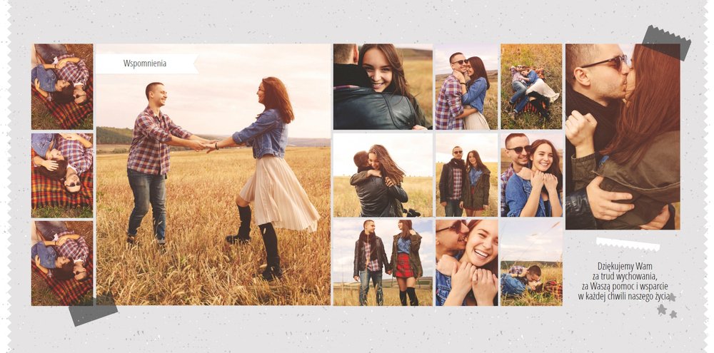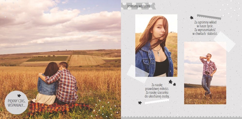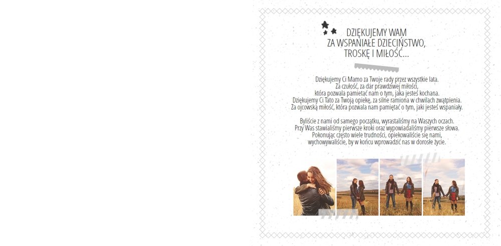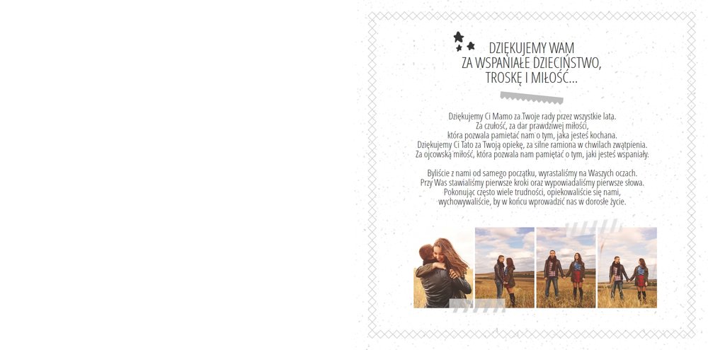 Podziękowanie dla rodziców to ważny moment na każdym weselu. Wiele par szuka pomysłu na gustowny i niepowtarzalny prezent dla rodziców. Zdjęcia szczęśliwych latorośli będą z pewnością pięknym i ponadczasowym upominkiem. Szablon “Kochanym Rodzicom” idealnie sprawdzi się jako wyraz wdzięczności za miłość i trud wychowania. Książka pozostaje w delikatnych odcieniach bieli i szarości, dodatkowo ozdabiają ją drobne elementy w postaci tasiemek i ramek. Z tym szablonem zaprojektujesz oryginalne podziękowania dla rodziców.