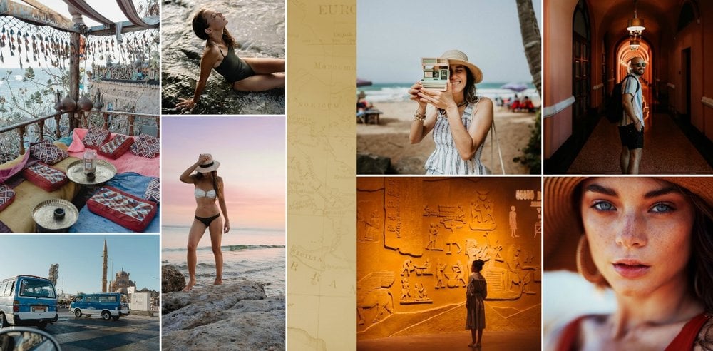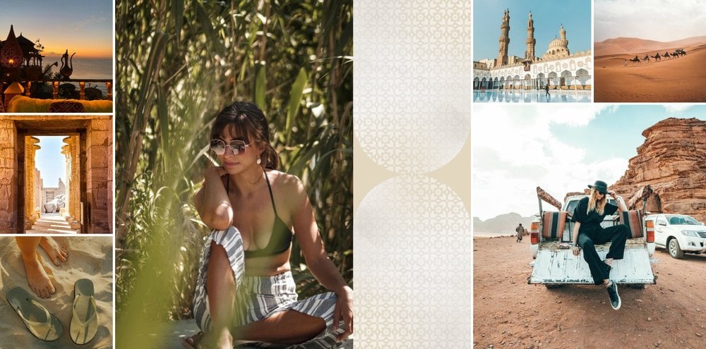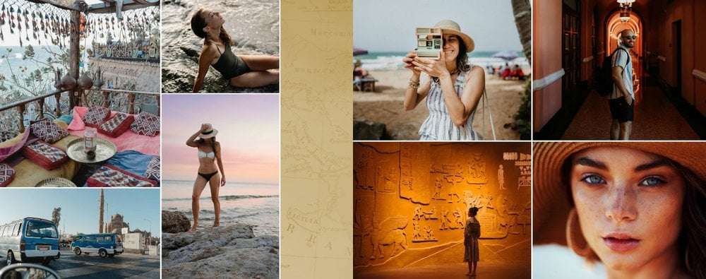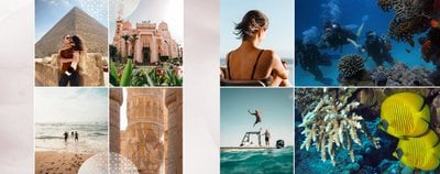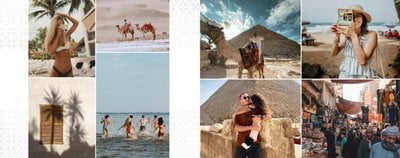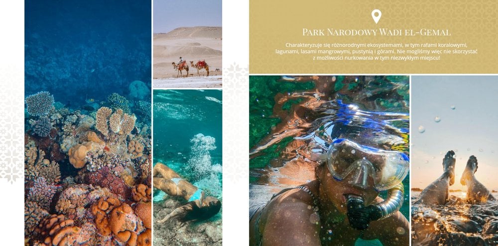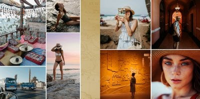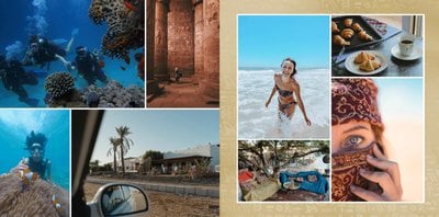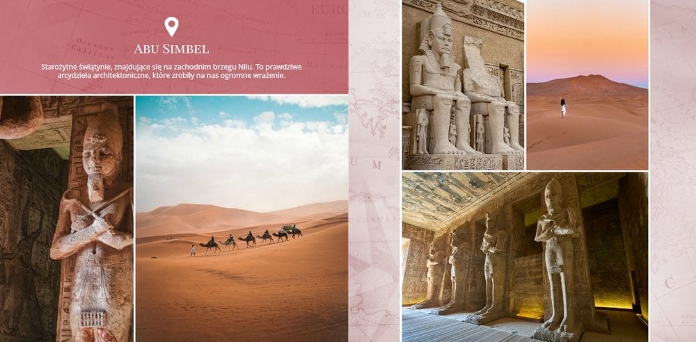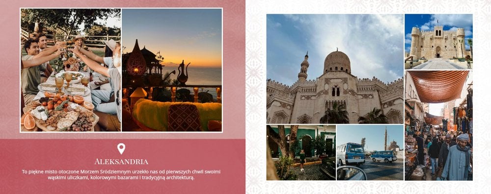 Design szablonu nawiązuje do bogatej i tajemniczej historii tego kraju, jego elegancji i orientalnego uroku. Piaskowo-ognista kolorystyka i charakterystyczne wzory utworzą wyjątkowe tło Twoich zdjęć z wakacji w Egipcie. Złoto symbolizuje bogactwo i luksus, podczas gdy czerwień odnosi się do wyrazistych zachodów słońca nad Nilem.