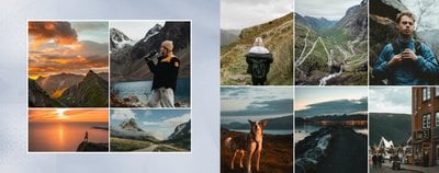 Paleta kolorystyczna szablonu nawiązuje do natury i współgra z chłodnym skandynawskim klimatem. Subtelne wzory na stronach projektu tworzą idealne tło Twoich zdjęć z podróży do Norwegii.