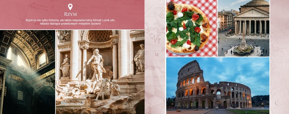 Zielono-czerwona kolorystyka stron, ujęta za pomocą eleganckiego wzornictwa idealnie oddaje klimat włoskich regionów. To w końcu kraj, słynący z wielkich arcydzieł sztuki, wspaniałej kuchni, malowniczych krajobrazów i chwytającej za serce atmosfery. Wszystkie te scenerie zachowaj we wnętrzu swojego projektu z szablonem "Kolekcja podróżnicza - Włochy".