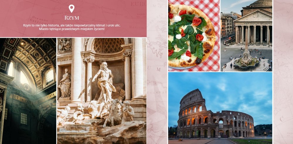 Zielono-czerwona kolorystyka stron, ujęta za pomocą eleganckiego wzornictwa idealnie oddaje klimat włoskich regionów. To w końcu kraj, słynący z wielkich arcydzieł sztuki, wspaniałej kuchni, malowniczych krajobrazów i chwytającej za serce atmosfery. Wszystkie te scenerie zachowaj we wnętrzu swojego projektu z szablonem "Kolekcja podróżnicza - Włochy".