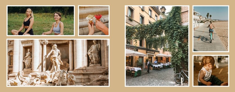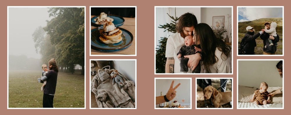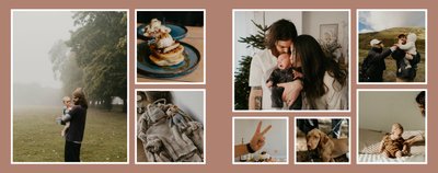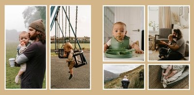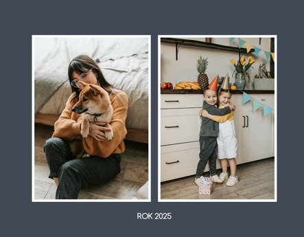 Albumy to skarbnica wspomnień, szczególnie jeśli zdjęcia do nich zebrane są z całego roku. Fotoksiążka to świetna alternatywa, dlatego w szablonie "Kolorowe podsumowanie roku" znajdziesz mnóstwo miejsca na fotografie zrobione w 2024 roku. Stworzony na podstawie szablonu "Tradycyjny album na zdjęcia" z zachowaniem minimalistycznego stylu, wzbogacony paletą pięciu pasujących do siebie kolorów. Ciemny granat, terracotta, musztardowy żółty, szałwia i beż - wszystkie te kolory pięknie podkreślą Twoje ulubione zdjęcia, jednocześnie zachowując przy tym elegancję tradycyjnego albumu.