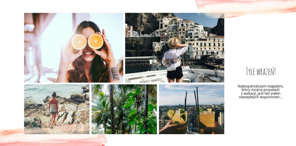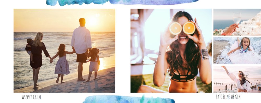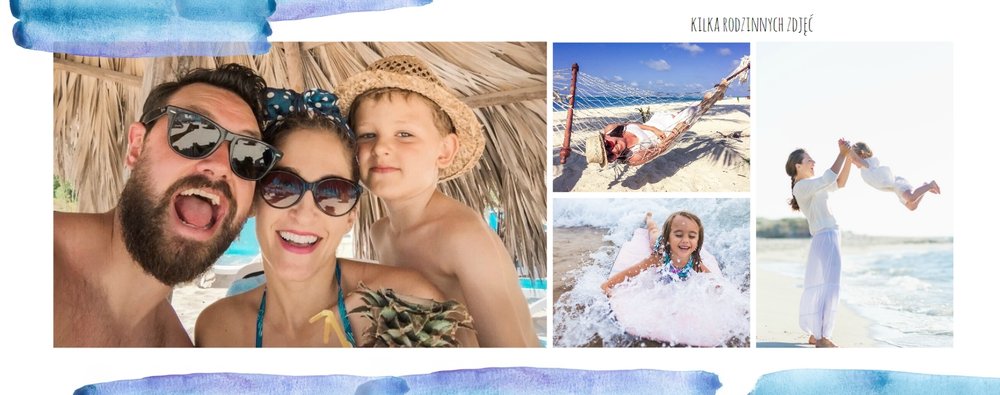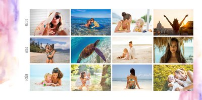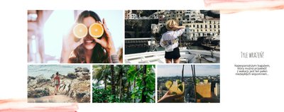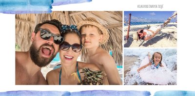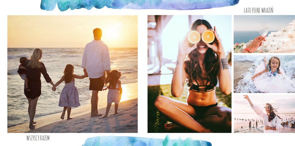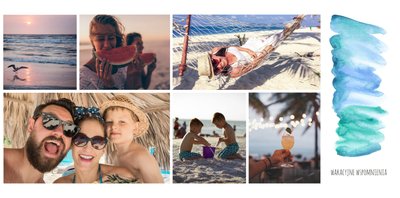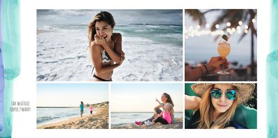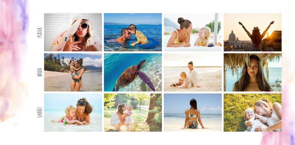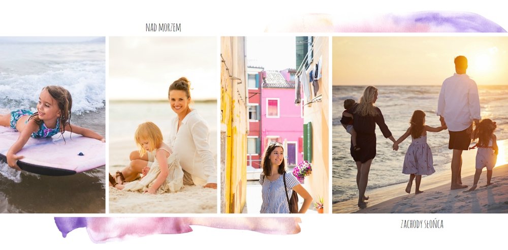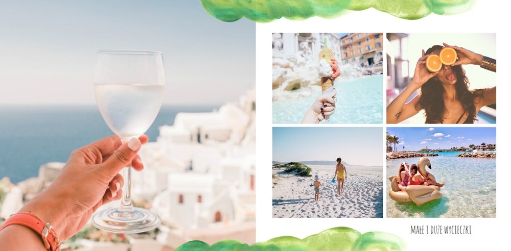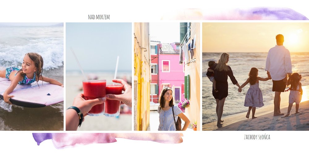 Kolorowe wakacje to barwny szablon z ciekawym motywem akwareli - idealny na Wasze letnie wspomnienia. Szablon jest uniwersalny, dlatego wakacyjna fotoksiążka może stać się zbiorem wyjazdowych wspomnień z całego roku, ale również z podróży z konkretnego miejsca np. z polskich gór, z nad morza, Mazur czy egzotycznej zagranicznej wycieczki. Oryginalne układy zdjęć i kontrast białych teł z kolorowymi akwarelami pięknie zaprezentuje się jako wydrukowana fotoksiążka.