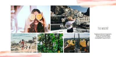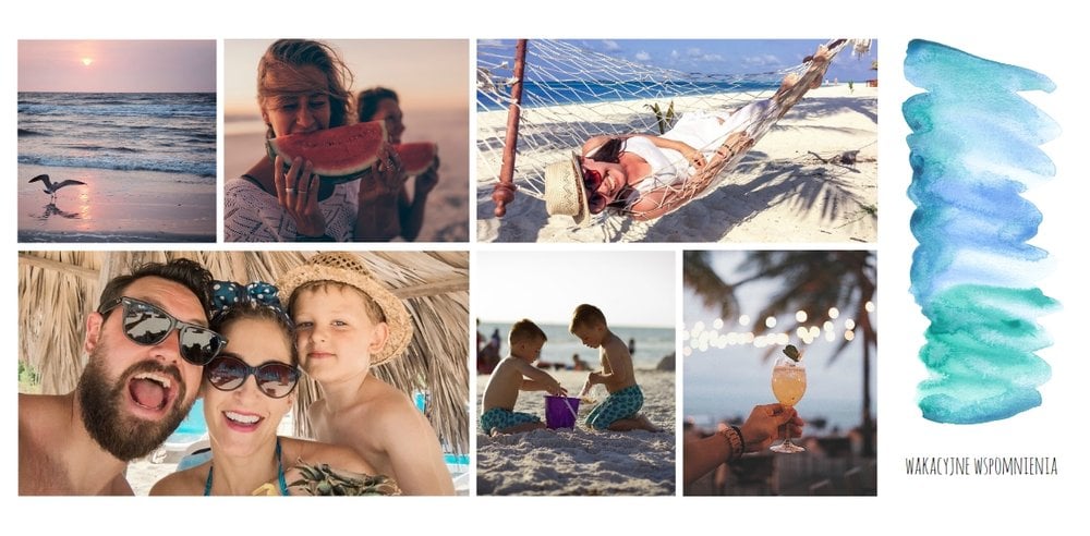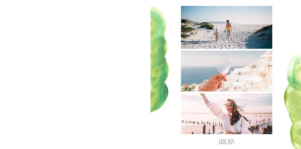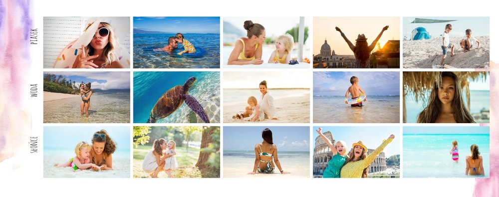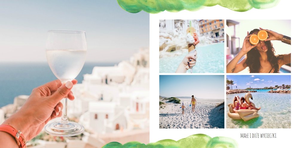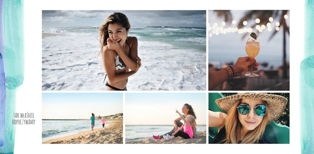 Kolorowe wakacje to barwny szablon z ciekawym motywem akwareli - idealny na Wasze letnie wspomnienia. Szablon jest uniwersalny, dlatego wakacyjna fotoksiążka może stać się zbiorem wyjazdowych wspomnień z całego roku, ale również z podróży z konkretnego miejsca np. z polskich gór, z nad morza, Mazur czy egzotycznej zagranicznej wycieczki. Oryginalne układy zdjęć i kontrast białych teł z kolorowymi akwarelami pięknie zaprezentuje się jako wydrukowana fotoksiążka.