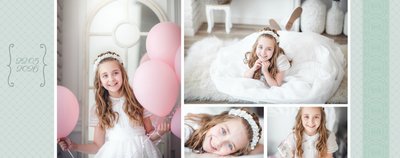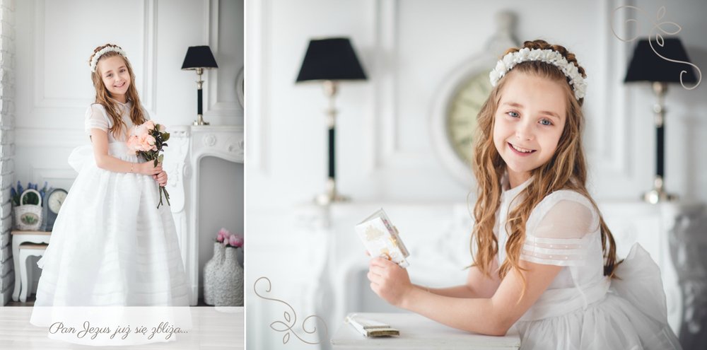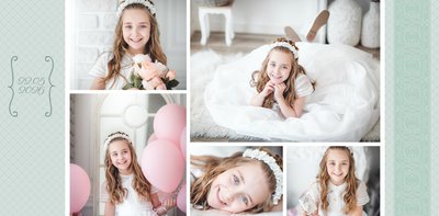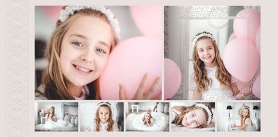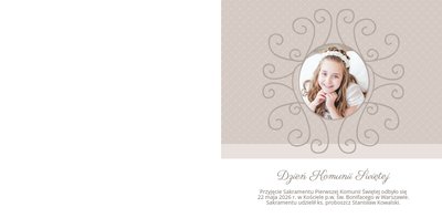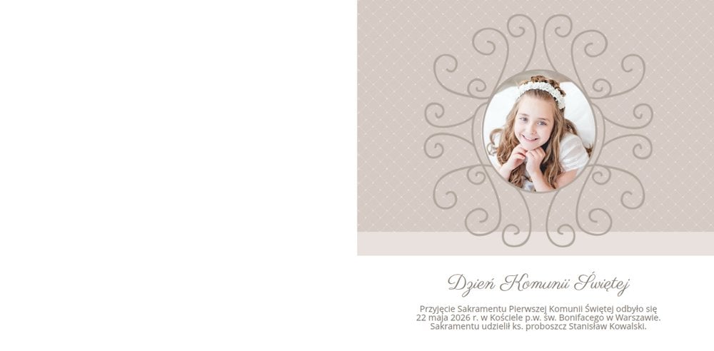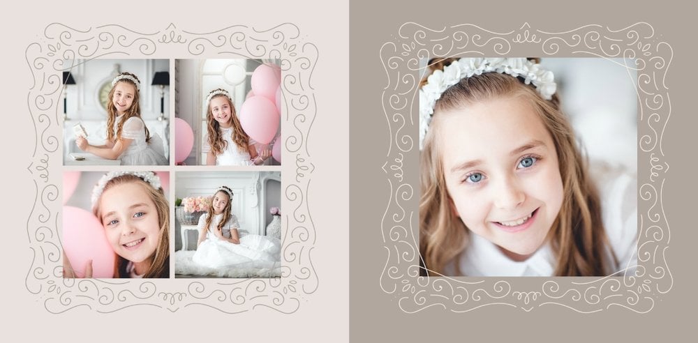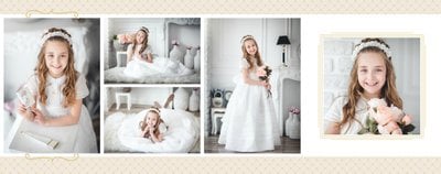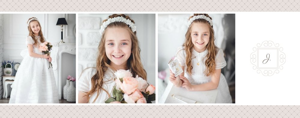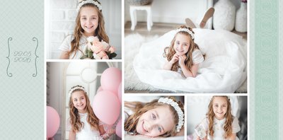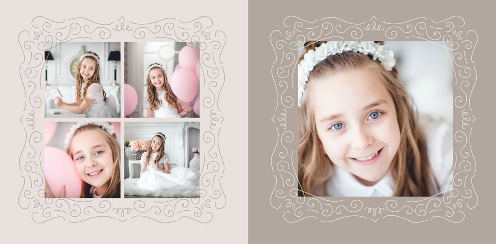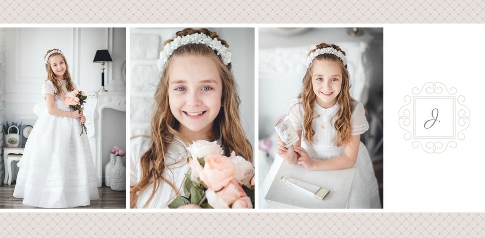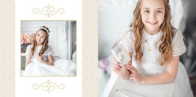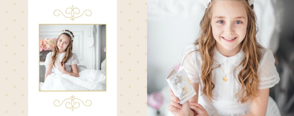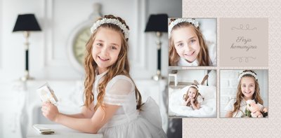 Szablon Komunia święta idealnie sprawdzi się przy projektowaniu fotoksiążki dziecka upamiętniającej przyjęcie Sakramentu Pierwszej Komunii Świętej. Dzięki niemu stworzysz dla dziecka komunijną pamiątkę na całe życie z jednego z najważniejszych wydarzeń w jego życiu. Strony utrzymane są w kolorach kremu, beżu i delikatnego turkusu, a elegancji dodają im piękne ornamenty, ramki i monogramy. Szablon idealny jako prezent dla Rodziców Chrzestnych oraz pamiątka Komunii.