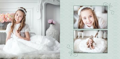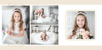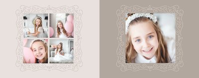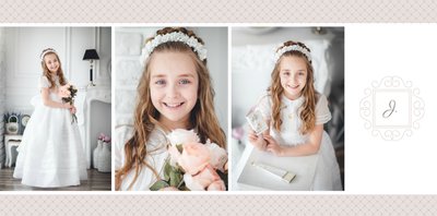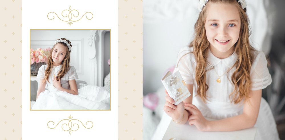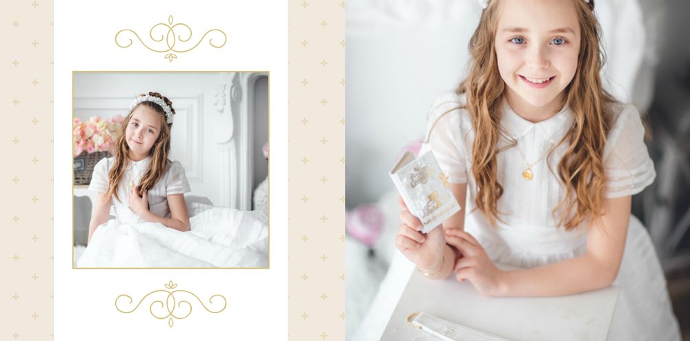 Szablon Komunia święta idealnie sprawdzi się przy projektowaniu fotoksiążki dziecka upamiętniającej przyjęcie Sakramentu Pierwszej Komunii Świętej. Dzięki niemu stworzysz dla dziecka komunijną pamiątkę na całe życie z jednego z najważniejszych wydarzeń w jego życiu. Strony utrzymane są w kolorach kremu, beżu i delikatnego turkusu, a elegancji dodają im piękne ornamenty, ramki i monogramy. Szablon idealny jako prezent dla Rodziców Chrzestnych oraz pamiątka Komunii.